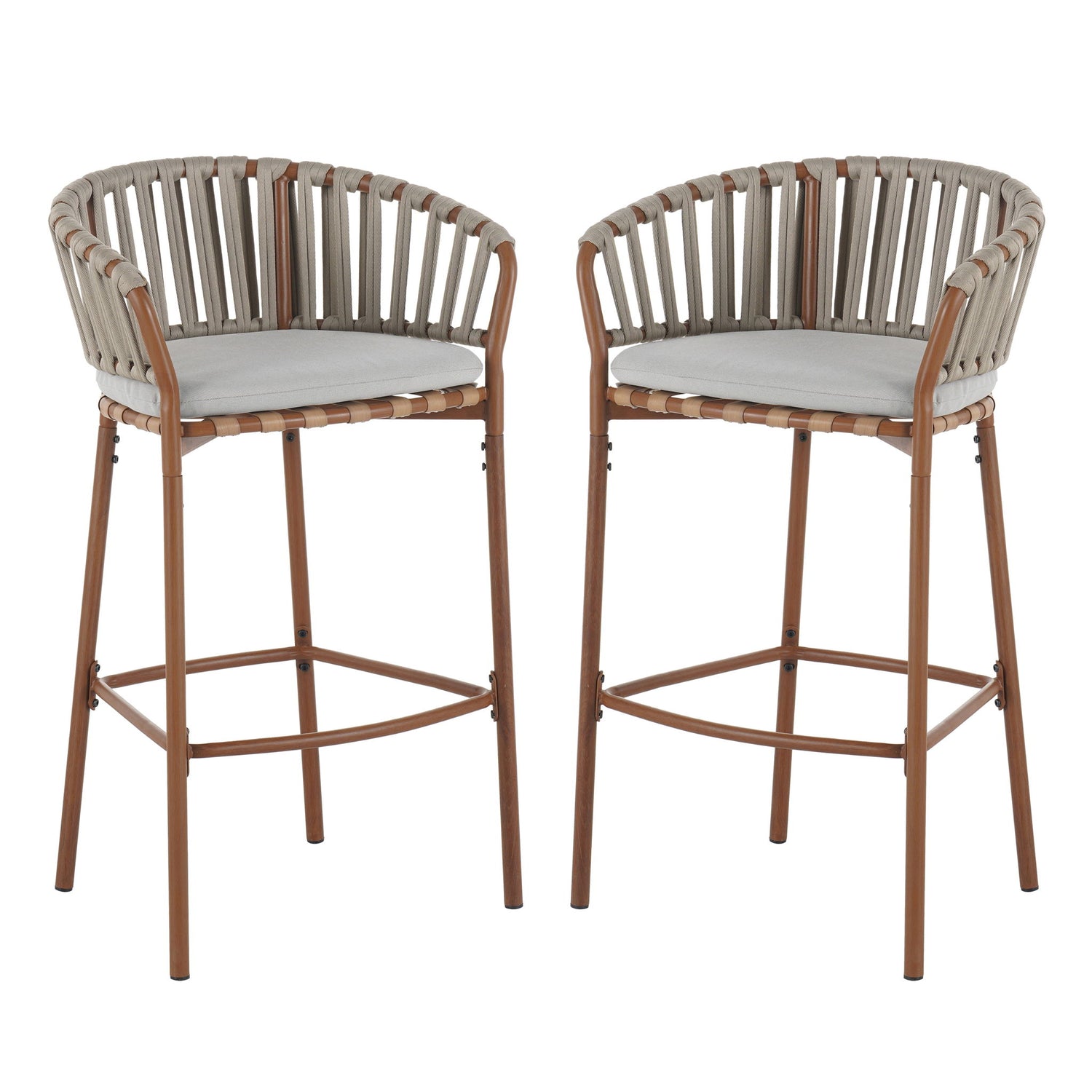 Lodi - Outdoor Matal Rope Barstool, Teak / Beige (Set of 2) - Teak / Beige is backordered and will ship as soon as it is back in stock.