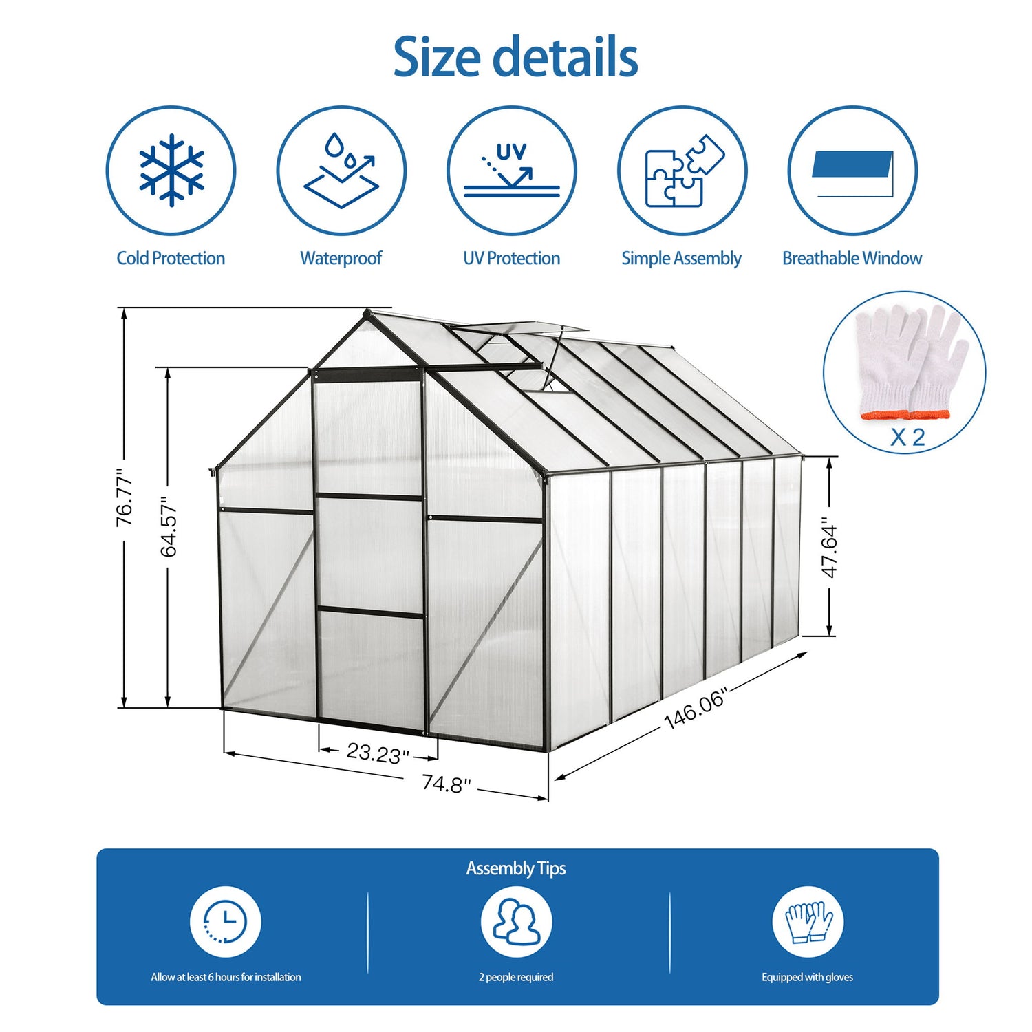 - Durable Construction: Polycarbonate board withstands extreme temperatures and allows sunlight while blocking harmful UV rays. The powder-coated aluminum alloy frame ensures durability and rust resistance, with optimal light transmission for plant growth.