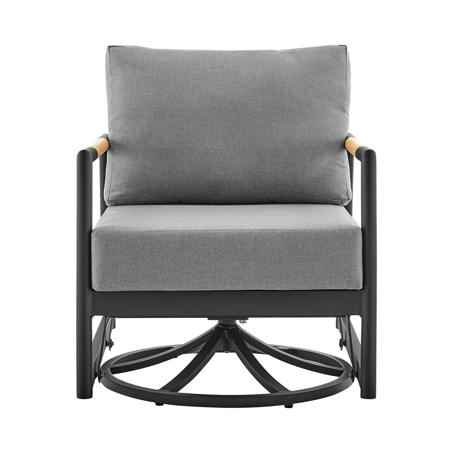 The Crown Outdoor Patio Swivel Glider Lounge Chair in Black Aluminum and Teak Wood with Cushions combines comfort and convenience. This outdoor gliding chair features durable and lightweight aluminum frame complete with warm teak accents on the arms. This combination is timeless, and its modern look is sure to please for many seasons and years to come. The UV and water-resistant cushions are ideal for any home and conveniently feature a zipper closure, making clean up a breeze. Moisture and water are an ongoing concern for outdoor furniture. Even if your furniture stays out of the rain, condensation is likely going to build up on the furniture regularly. Polyester is not permeated easily by water. Secondly, polyester resists the types of molds and mildews that will take root in fabrics made of natural fibers. This means the furniture will have a longer life if it is made from polyester. Minimal maintenance is required for the aluminum frame. Often, using a typical garden hose to rinse off the patio furniture will do. For more stubborn residue, a little warm water and soap will usually suffice. Besides cleaning occasionally, there is no other upkeep. The 360-degree swivel functionality and gliding motion give you the ideal seating experience. The Crown outdoor lounge chair is available in a black aluminum finish with natural teak accents and gray cushions.