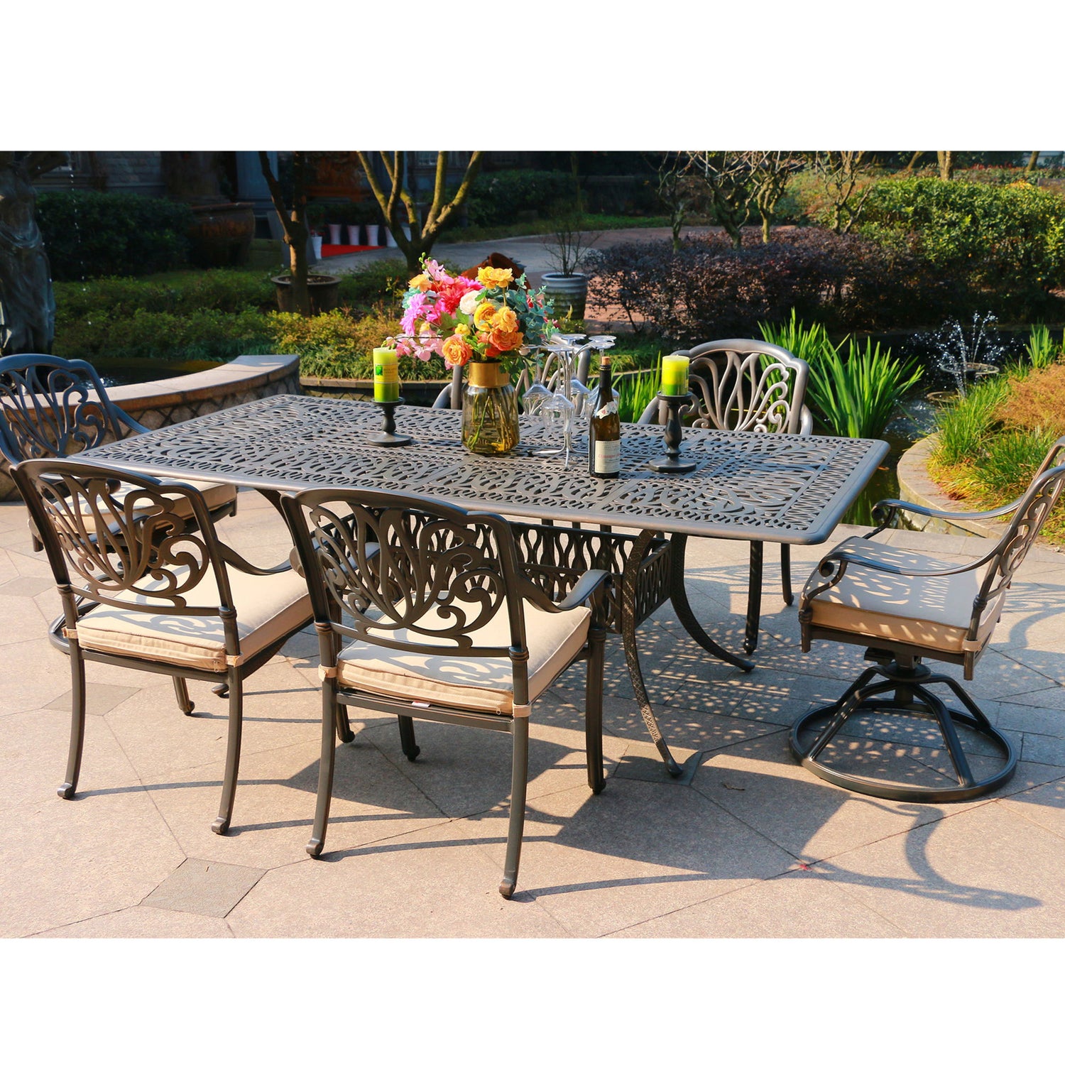 Rectangular Long Dining Set With Sunbrella Cushions - Blue / 7 Pc. Table, 6 Swivel Chairs is backordered and will ship as soon as it is back in stock.