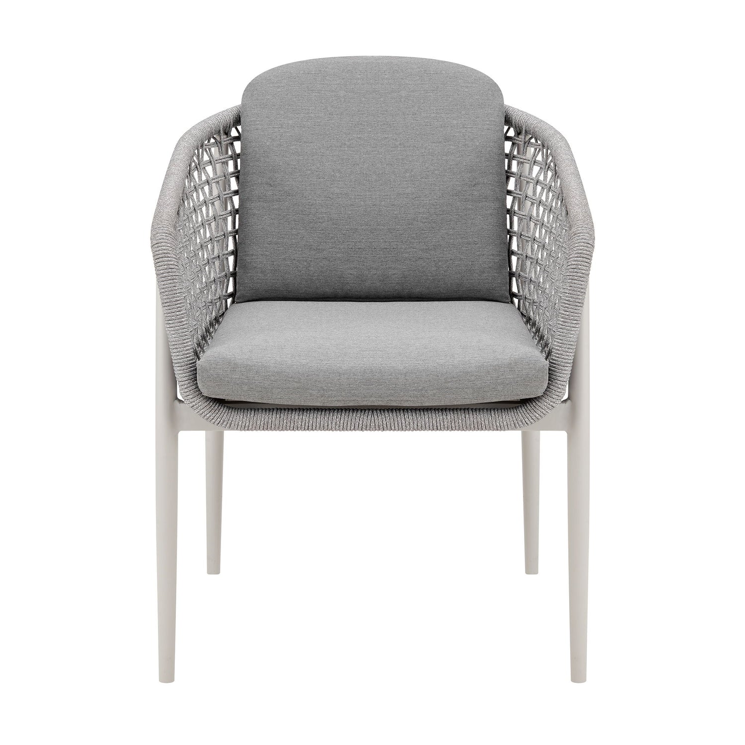 Introducing the Rhodes Outdoor Patio Dining Chair – a harmonious blend of contemporary design and outdoor comfort meticulously crafted to redefine your dining experience. This elegant dining chair seamlessly combines the sleek allure of aluminum with the tactile sophistication of light gray rope detailing and the plush comfort of cushions made from solution-dyed acrylic fabric, creating a stylish and enduring addition to your outdoor furniture collection. Crafted with precision, the Rhodes Outdoor Patio Dining Chair features a robust aluminum frame, ensuring both durability and a modern aesthetic that effortlessly complements various outdoor settings. The aluminum frame not only adds to the chair's sleek charm but also provides sturdiness, making it a reliable and resilient choice for your outdoor dining needs. Designed for outdoor durability, the Rhodes Dining Chair boasts water-resistant and UV-resistant features, standing as a steadfast and stylish seating solution for your patio or garden area. Whether bathed in sunlight or facing unexpected rain, this dining chair remains a reliable and eye-catching addition to your outdoor gatherings. The incorporation of light gray rope detailing adds a unique visual dimension to the design, creating a captivating contrast with the smooth aluminum frame. Paired with removable cushions with a zippered cover, the Rhodes Dining Chair invites you to dine in both style and comfort. The solution-dyed acrylic fabric ensures vibrant colors and resistance to fading, offering lasting beauty in the face of changing weather conditions. Whether you're hosting a lively dinner party or enjoying a quiet family meal, the Rhodes Outdoor Patio Dining Chair provides an inviting and luxurious seating option for your outdoor dining space.