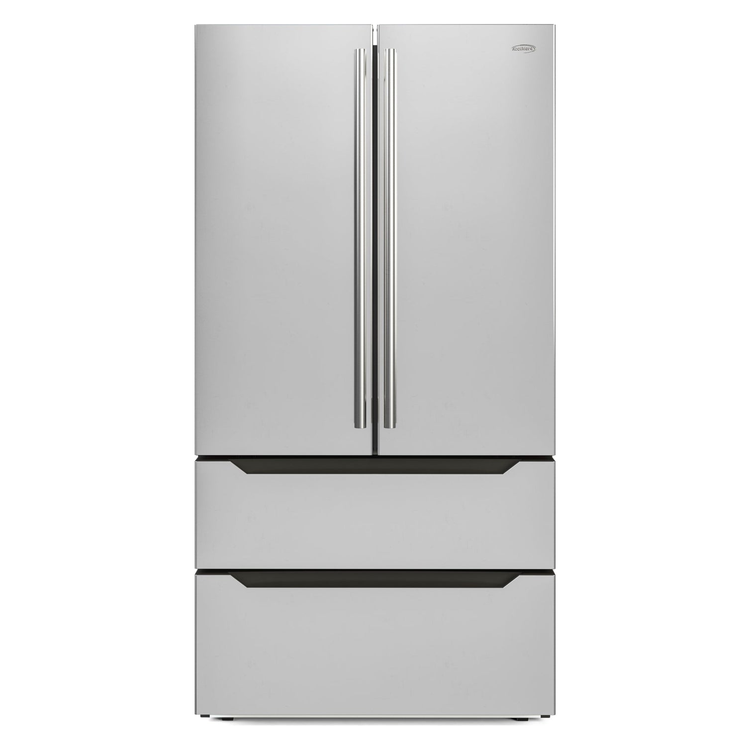 This frost-free French door refrigerator is designed with two separate large freezer drawers which can store everyday items on the top or deep freezer items on the bottom. The dual crispers also feature humidity control in the produce drawers, which can keep fruits and vegetables, fresher for longer than standard drawers.