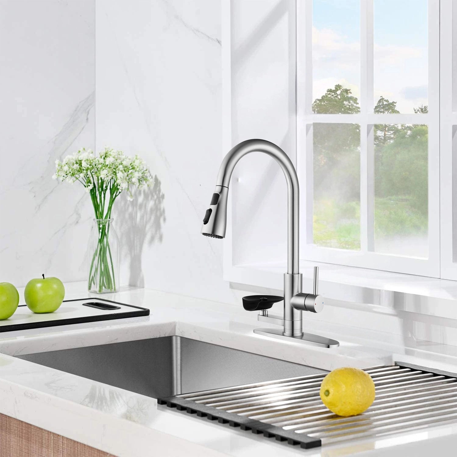 • 3-in-1 Functional Design: Integrates a glass rinser, pull-down sprayer, and main faucet into one compact unit, saving space and enhancing kitchen efficiency