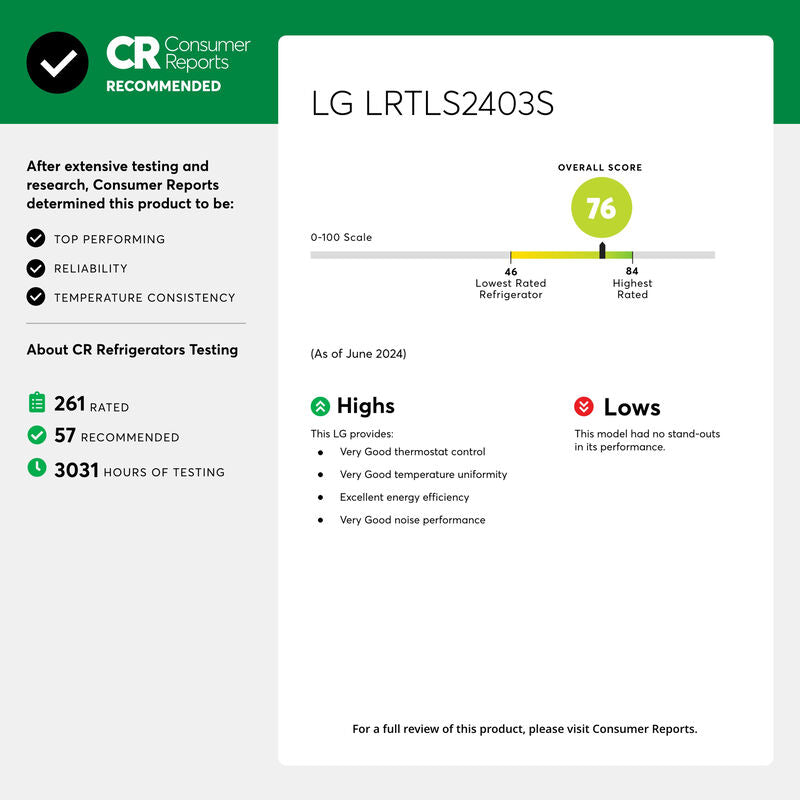 LG LRTLS2403S 33 in. 23.8 cu. ft. Top Freezer Refrigerator with Internal Water Dispenser - Stainless Steel