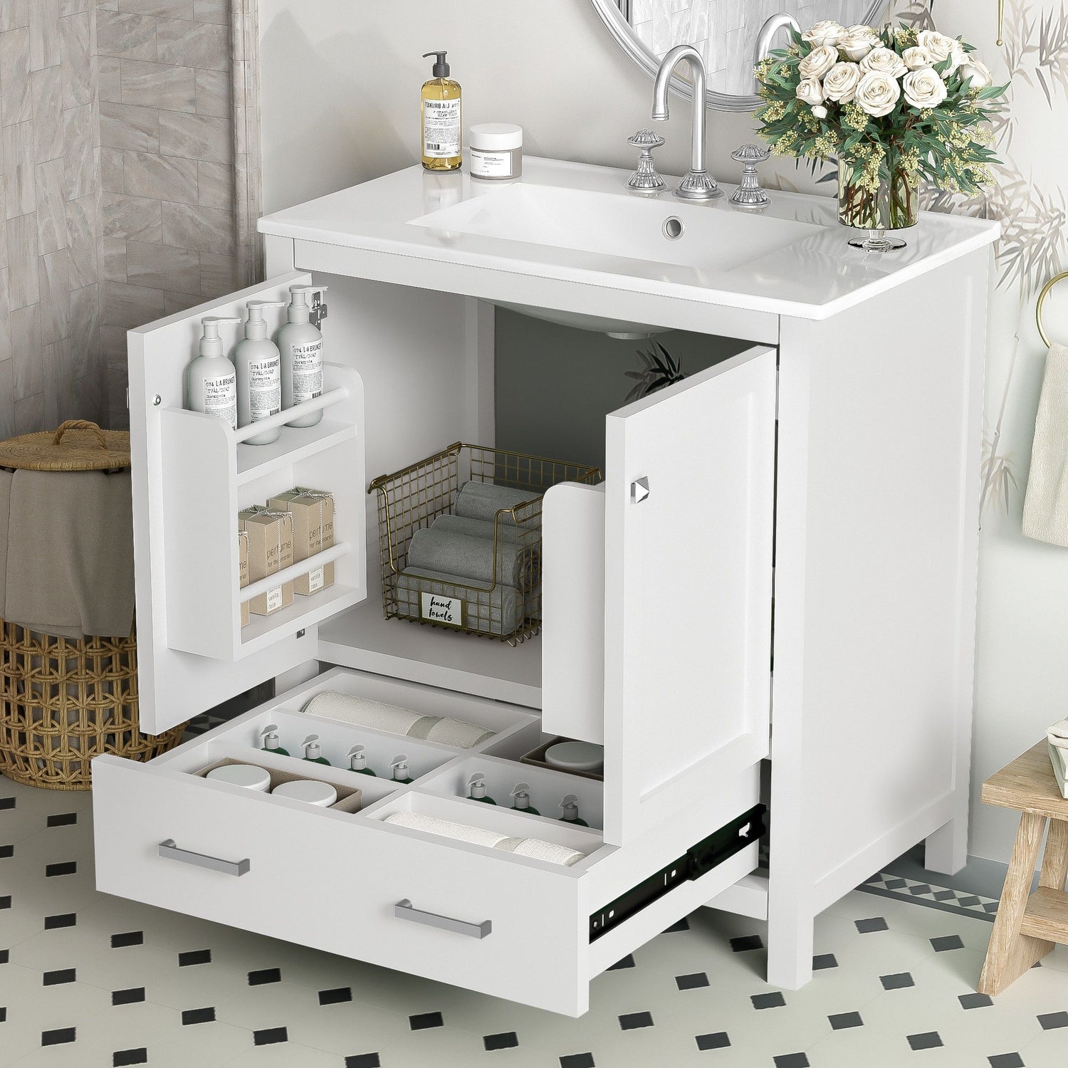 - Powerful Storage Function: Features built-in shelves on cabinet doors and partitioned drawer compartments for organized storage of bath essentials like cosmetics, shampoos, and razors.