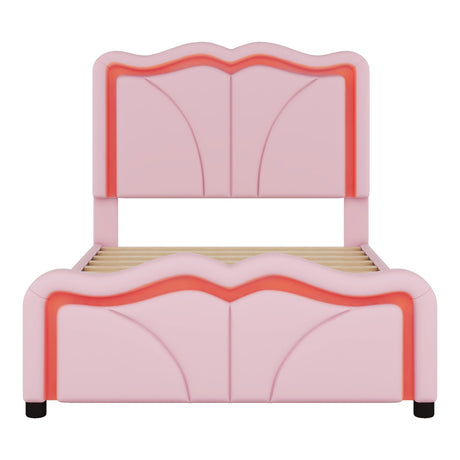 Upholstered Platform Bed & Curve Shaped And Height Adjustable Headboard, LED Light Strips