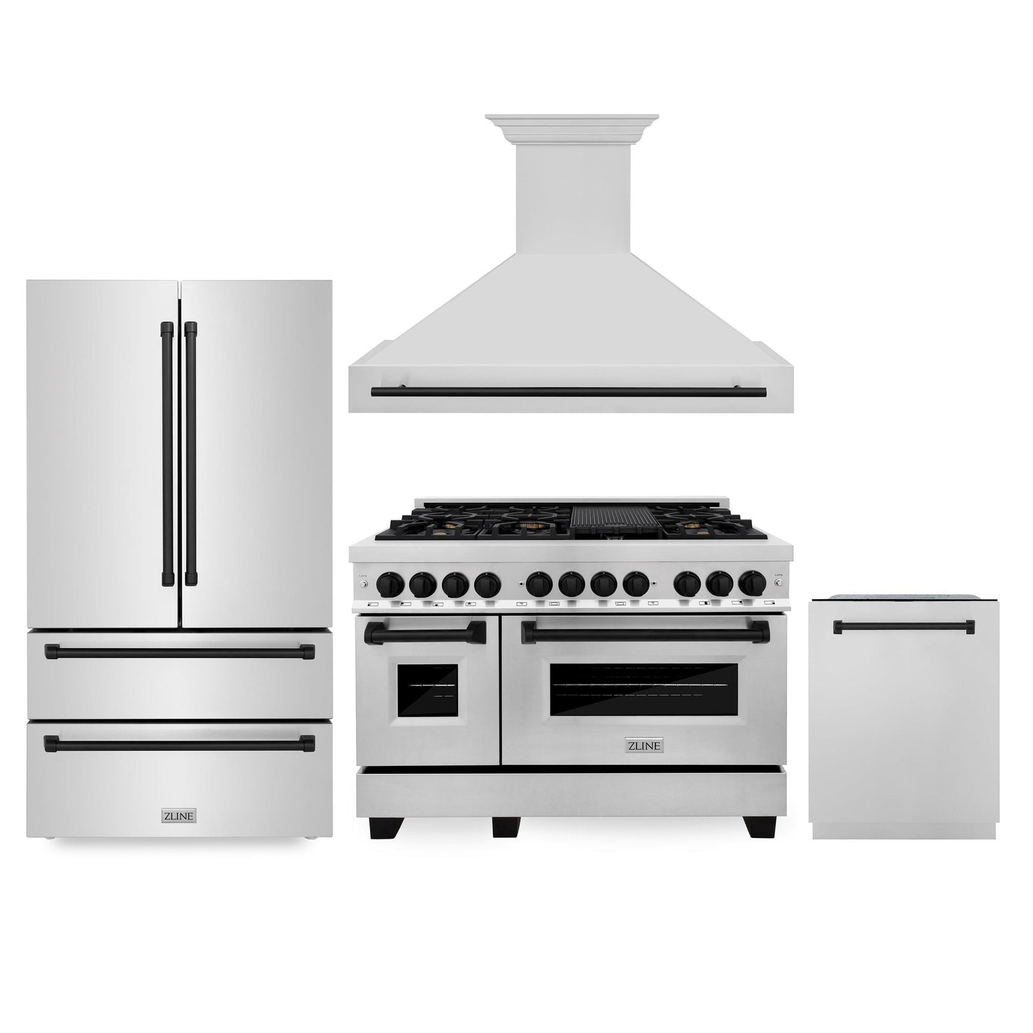 ZLINE 48" Autograph Edition Kitchen Package with Stainless Steel Dual Fuel Range, Range Hood, Dishwasher and Refrigeration with Matte Black Accents (4KAPR-RARHDWM48-MB) - (4KAPRRARHDWM48MB) is backordered and will ship as soon as it is back in stock.