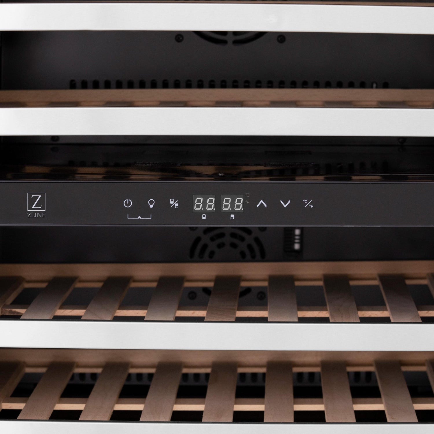 ZLINE 24" Autograph Edition Dual Zone 44-Bottle Wine Cooler in Stainless Steel with Wood Shelf and Matte Black Accents (RWVZ-UD-24-MB) - (RWVZUD24MB)