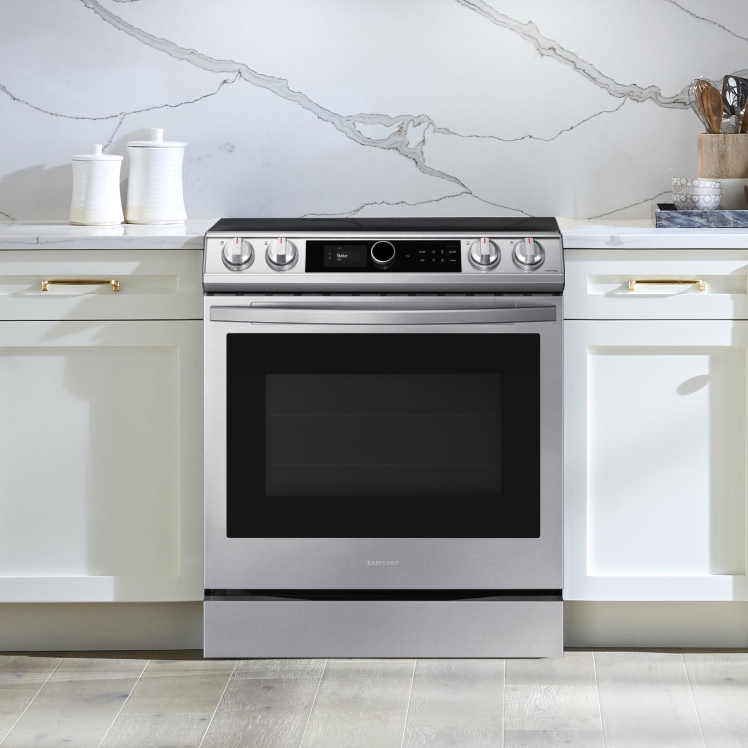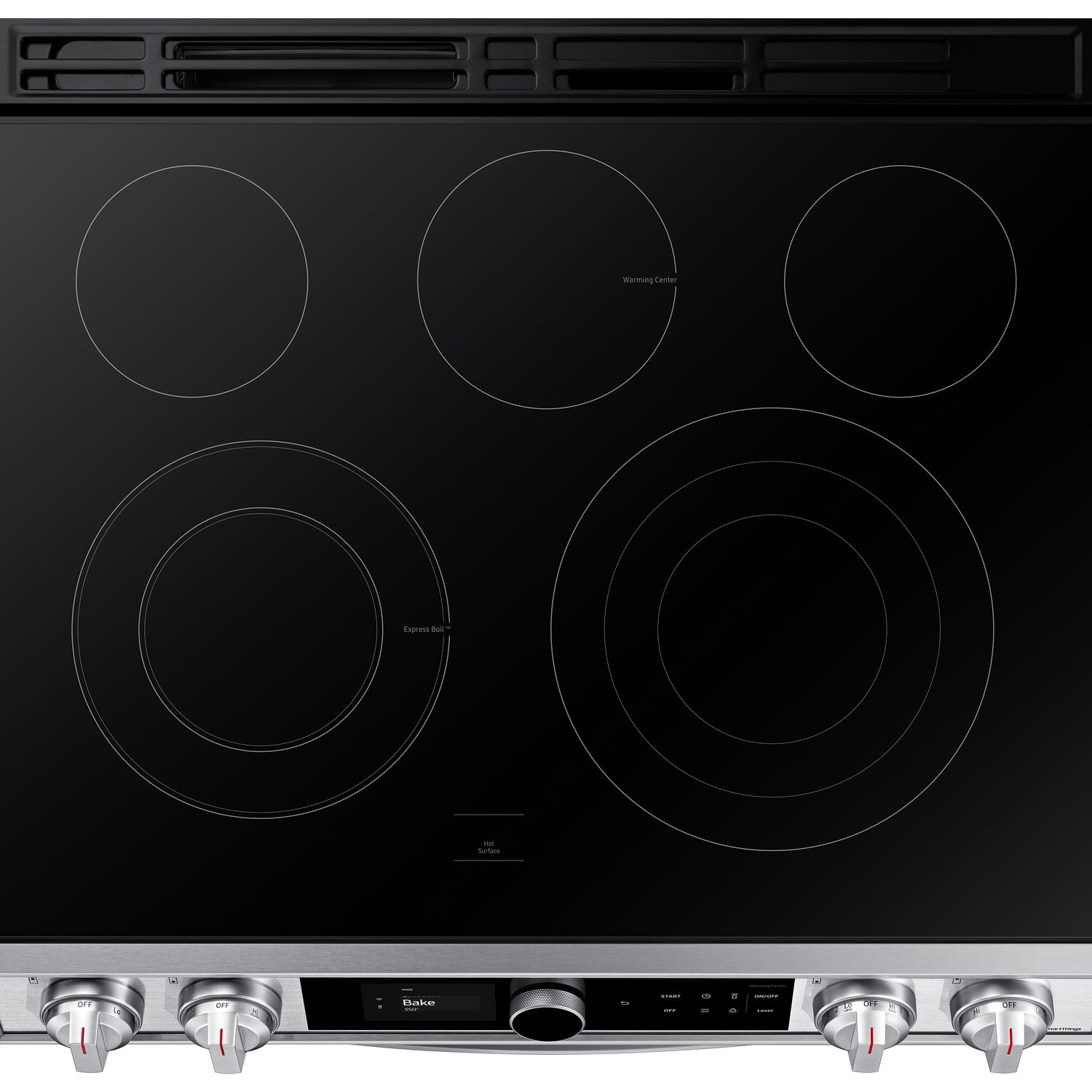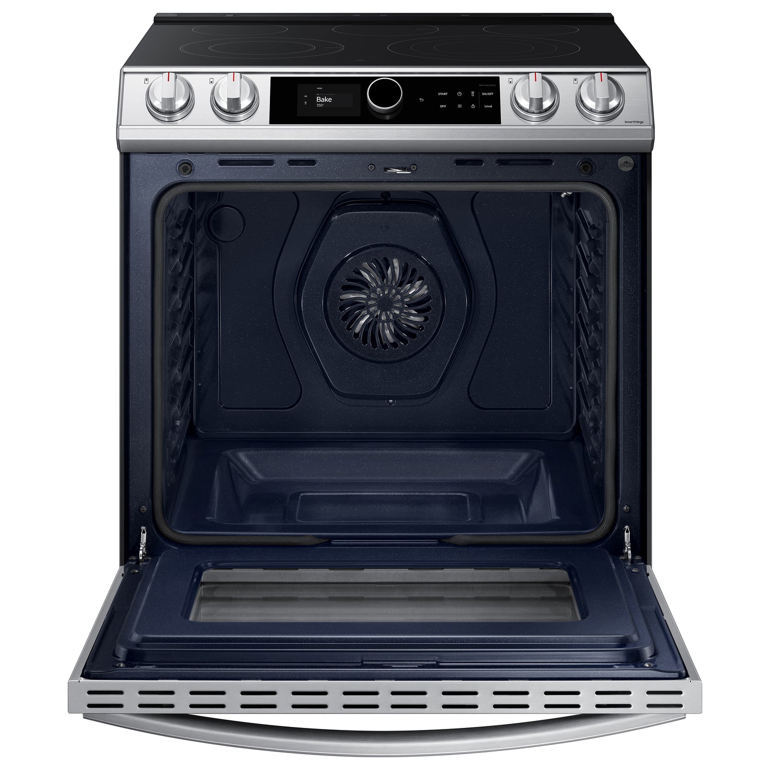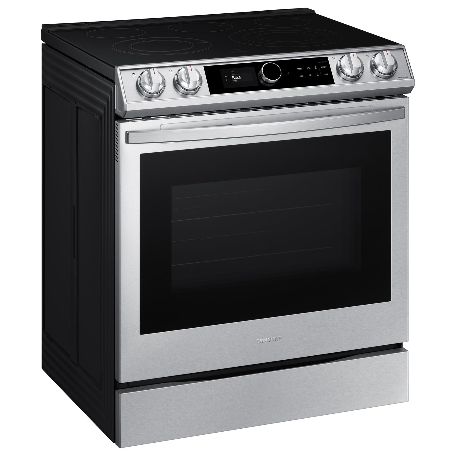 (B)Learns How You Like to Cook(/B)(P)The new Smart Dial simplifies oven settings in a single dial and intuitively learns based on your cooking preferences.(/P)(BR)(B)Air Fry - Healthier* Cooking with a Crunch(/B)(P)Cooking just got healthier* with new Air Fry mode. Using little to no oil, you can quickly prepare your favorite fried foods right in your oven. Air Fry tray included.(/P)(BR)(B)Save Time with Convection+(/B)(P)Powerful Convection+ saves you time by cooking food fast and more evenly. Fan with a heated element circulates hot air in the oven for perfect baking and roasting.(/P)(BR)(B)Illuminated Knobs(/B)(P)Blue illuminated knobs let you know when your cooktop is on or off.(/P)(BR)(B)All Shine(/B)(P)Fingerprint-resistant for an everyday beautiful finish.(/P)(BR)(B)Unbelievably Fast(/B)(P)With Samsung's 3600 W Express Boil(TM) - no element is more powerful.* Rapidly go from high heat for boiling water and searing meat or turn down to a true simmer - ideal for melting chocolate