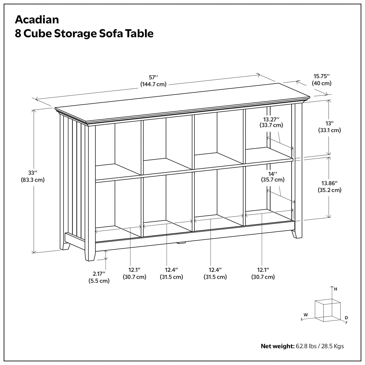 57.0"W x 15.75"D x 33.0"H - 62.8 lb