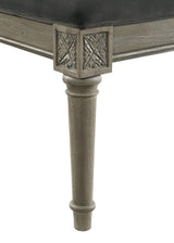 Add an elegant touch to your home with the updated transitional design of this padded bench. It features a gorgeous French neoclassical design that's updated for today's tastes. The frame and legs feature a stunning sand blasted wood finish with just the right amount of French grey. The turned tapered legs with carved details add a graceful touch. The plush padded cushion is upholstered with a charcoal grey matte velvet that adds both style and comfort.(BR)(BR)(The above description may contain details that pertain to other items in this collection as opposed to this item in particular. Please contact us if you have any questions)