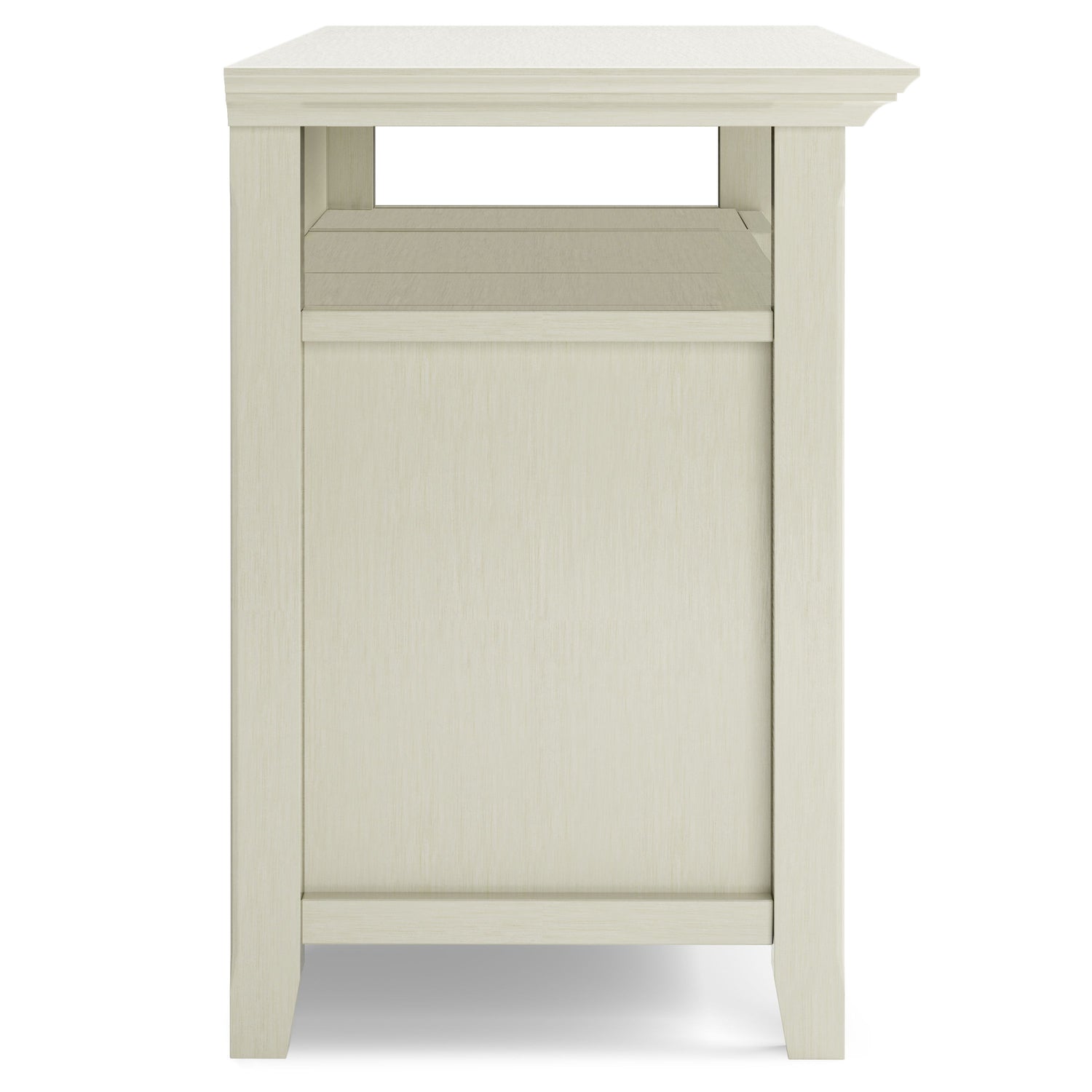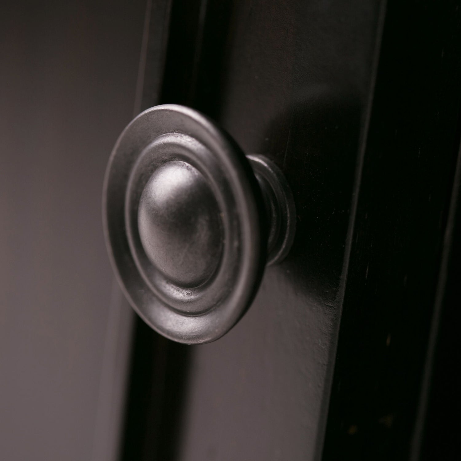 - Transitional design includes tapered legs, panel framed door fronts, and antique bronze round decorative knobs