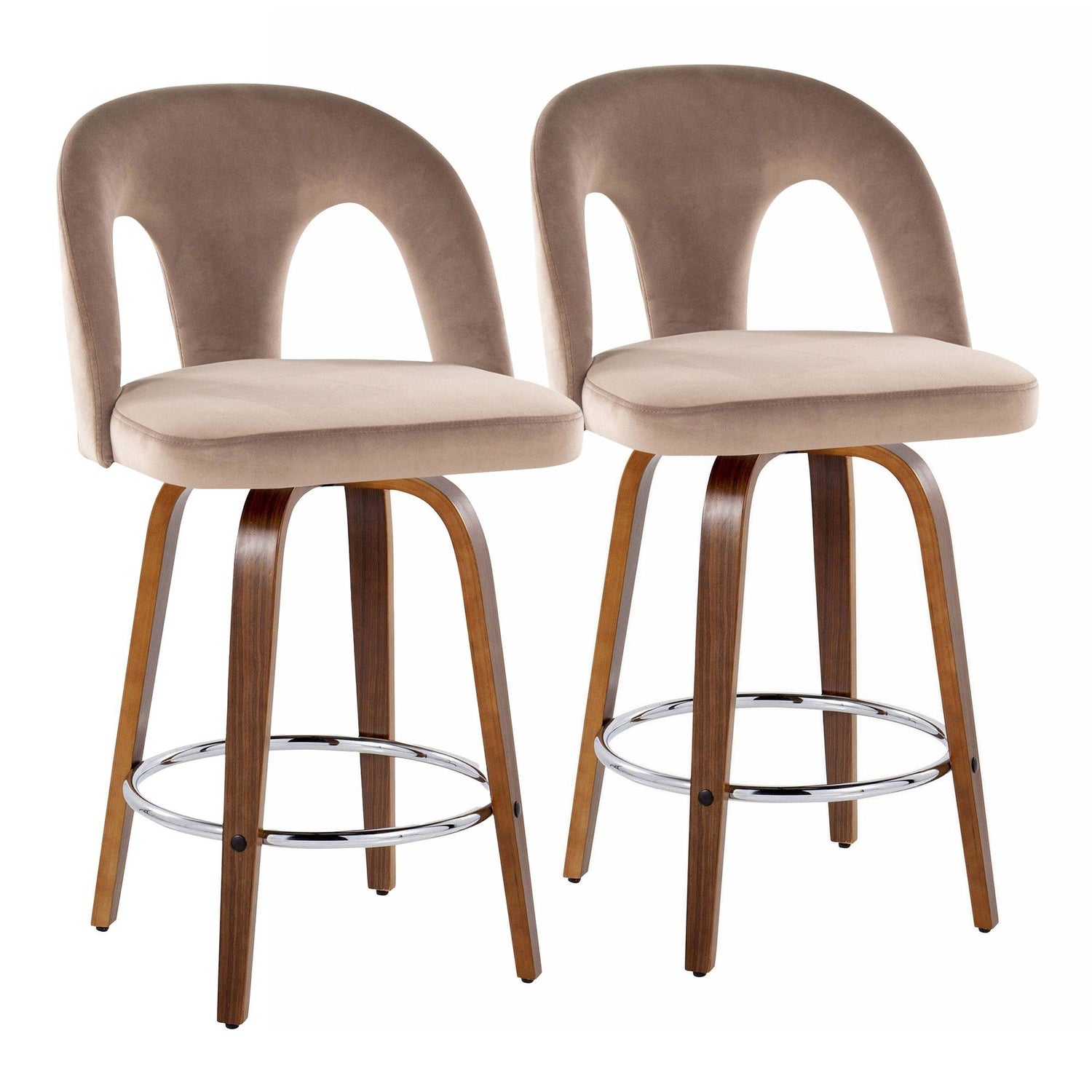 Ava - Upholstered Fixed-Height Barstool (Set of 2) - Walnut Wood, Taupe Velvet, Chrome Metal
