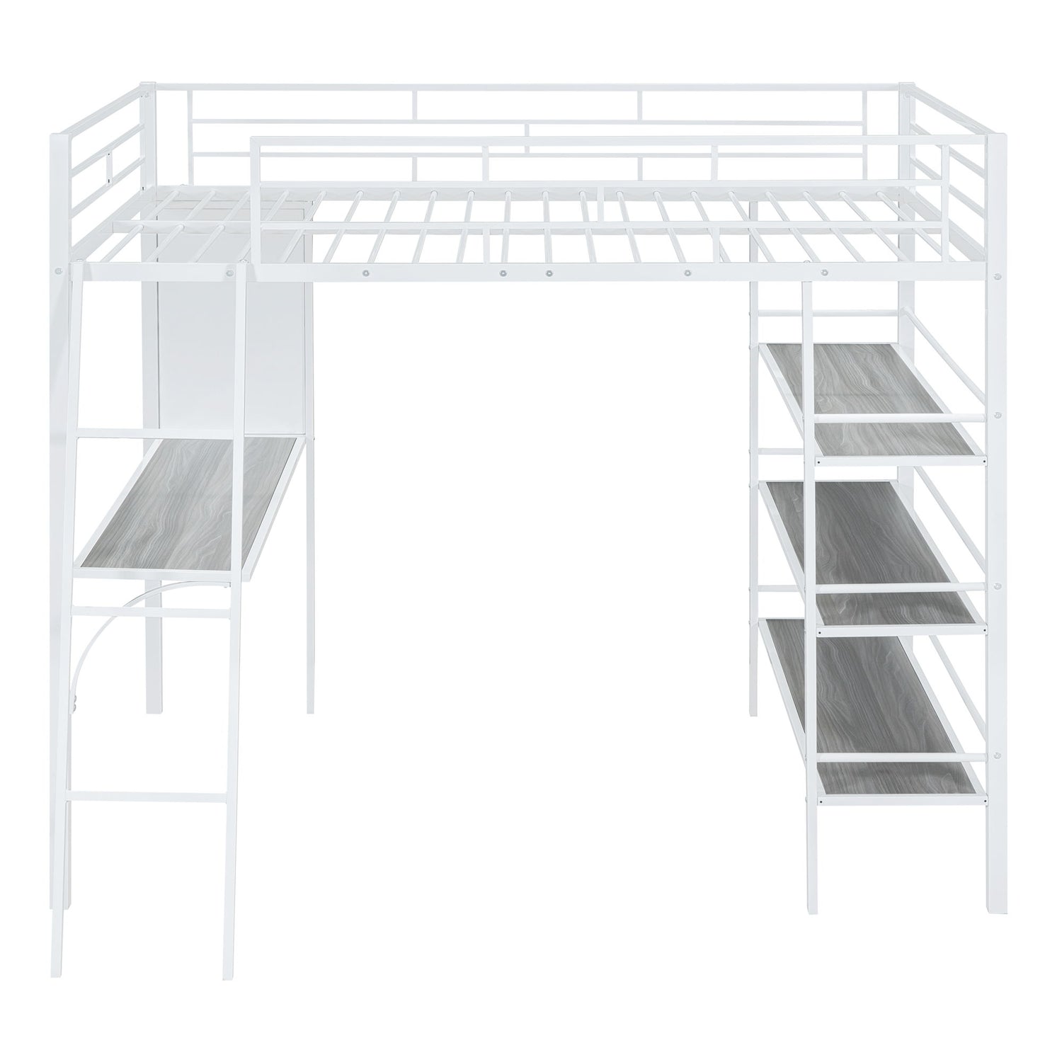 Full Size Loft Bed With 3 Layers Of Shelves And Desk, Stylish Frame Bed - White