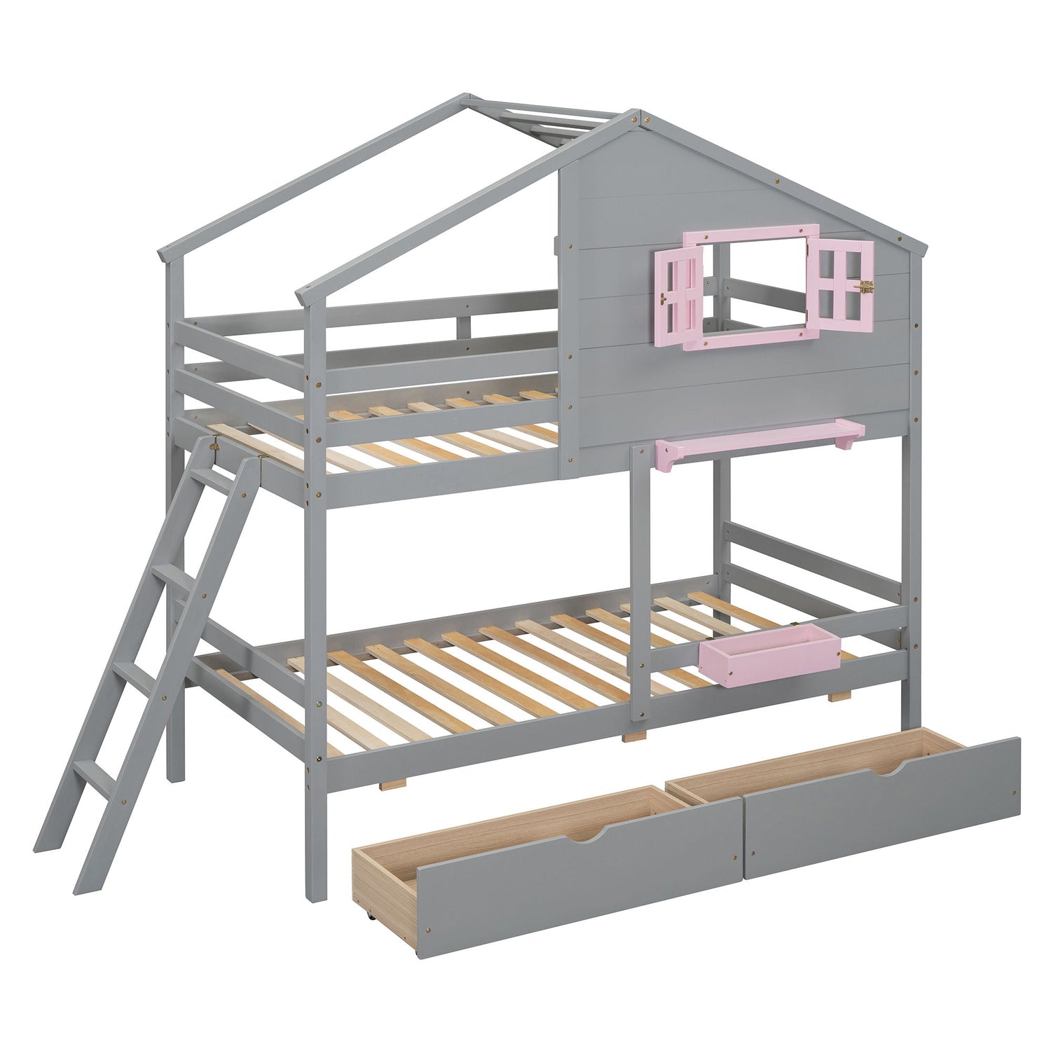 Twin Over Twin Bunk Bed With Drawers, Playhouse Inspired, Storage Box, Shelf, Window, And Roof - Gray