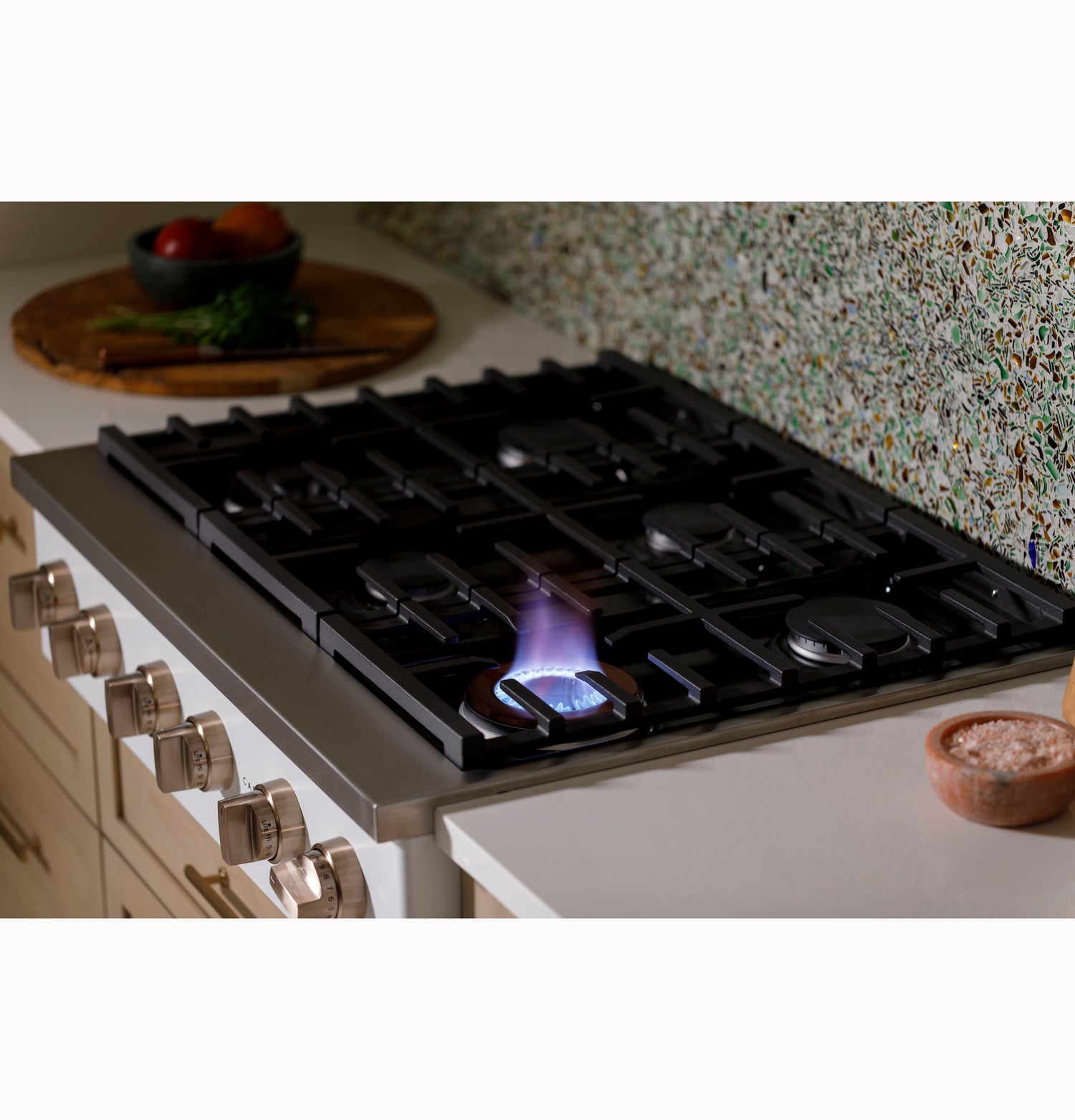 (P)Revel in this Cafe 36-inch gas cooktop. Commercial-style design and function with six burners give you the versatility you need to host any-sized soiree. Notably, the industry-exclusive Inspiral Burner is as beautiful as it is powerful, and the color-matched manifold is the only one of its kind.(/P)