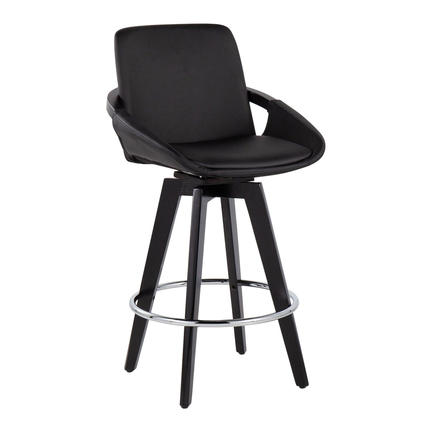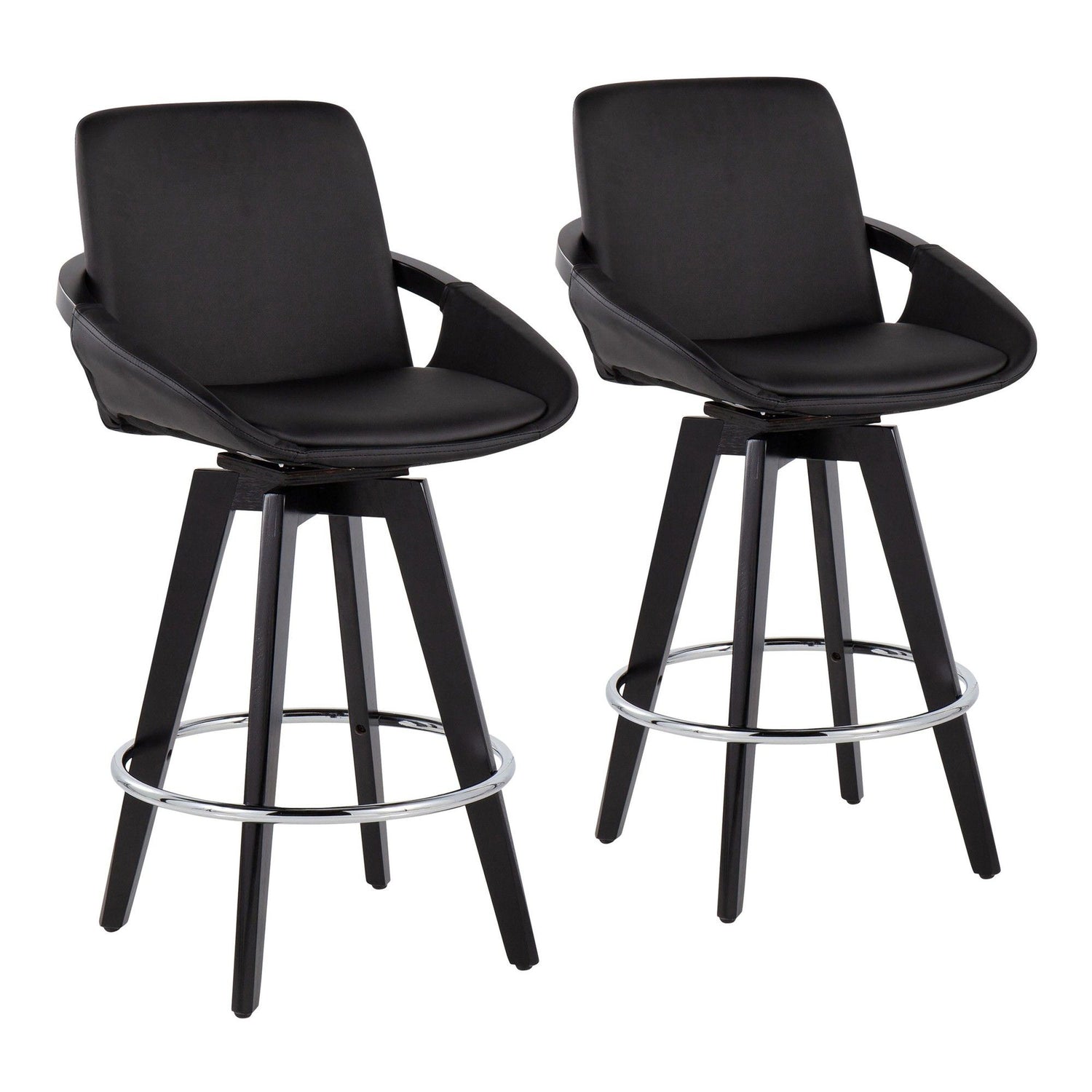 Cosmo - Fixed-Height Counter Stool With Swivel (Set of 2) - Black Wood With Round Chrome Metal Footrest And Black Faux Leather Seat