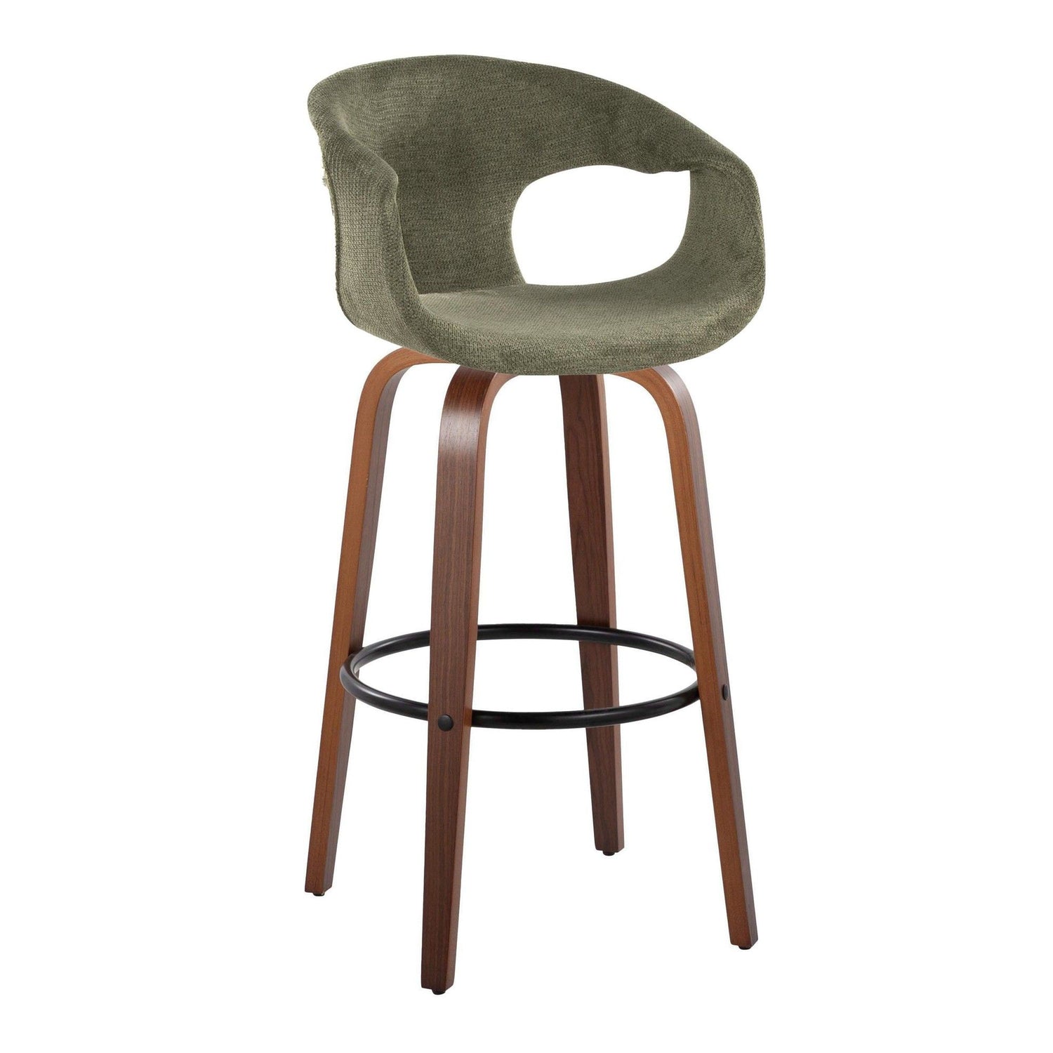 Curvo - 30" Fixed-Height Barstool With Swivel And Round Black Metal Footrest (Set of 2) - Walnut Wood And Green Fabric