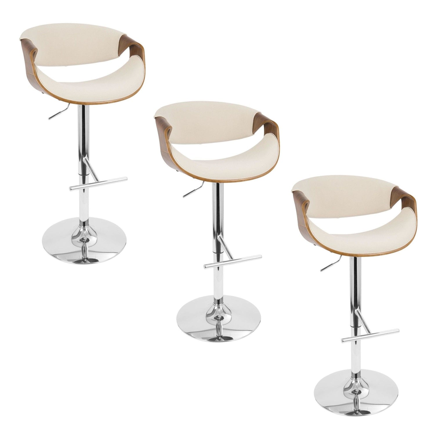 Curvo - Adjustable Barstool With Swivel (Set of 3) - Chrome Metal, Walnut Wood And Cream Fabric With Straight T Footrest