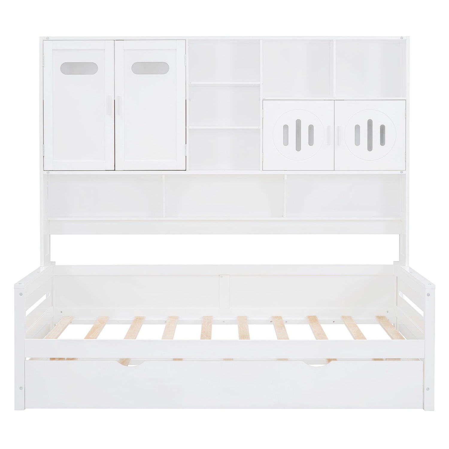 Twin Size Wooden Daybed With Twin Size Trundle, And All In One Cabinet And Shelf - White