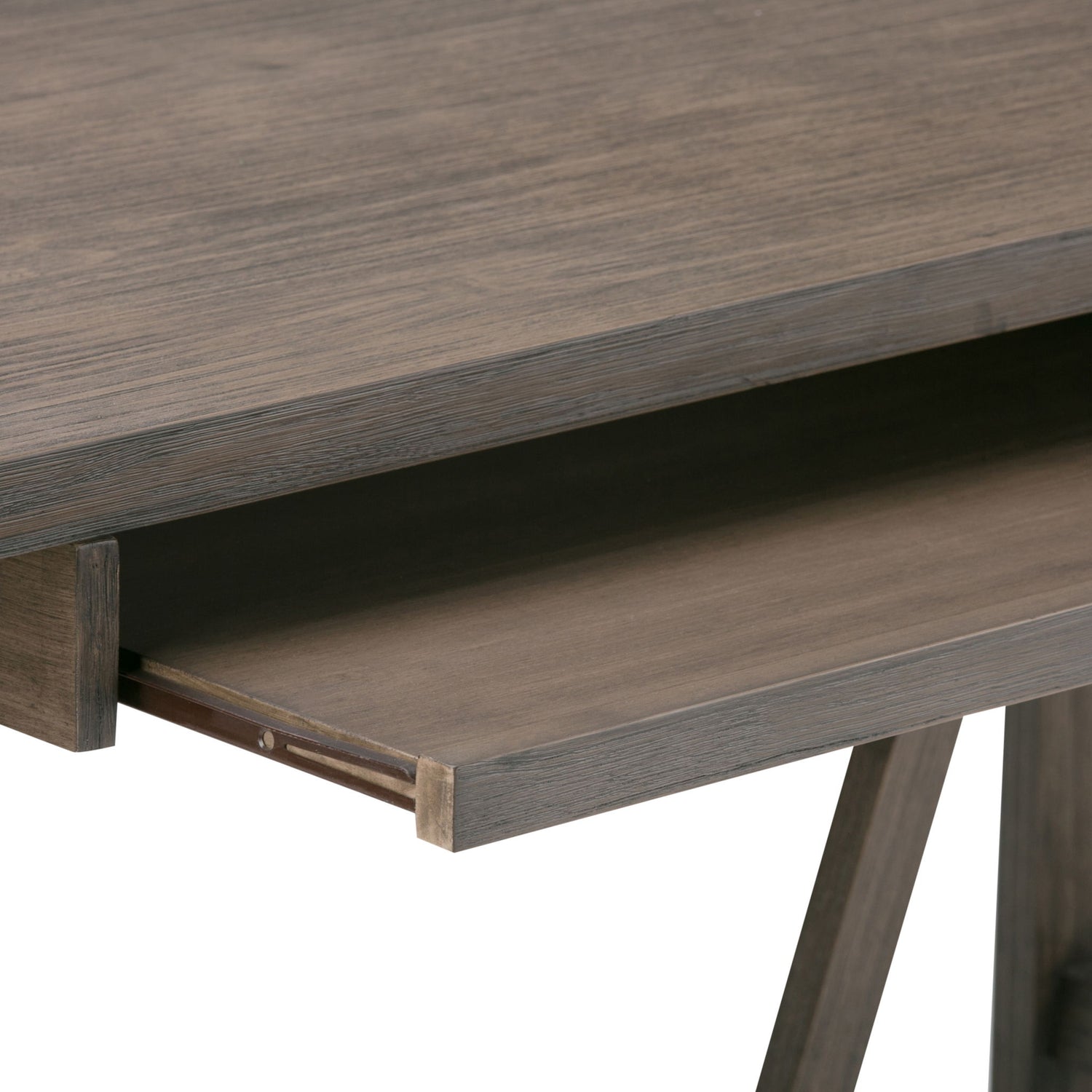 - Features sturdy trestle style supports, keyboard tray and a simple, extra thick table top surface