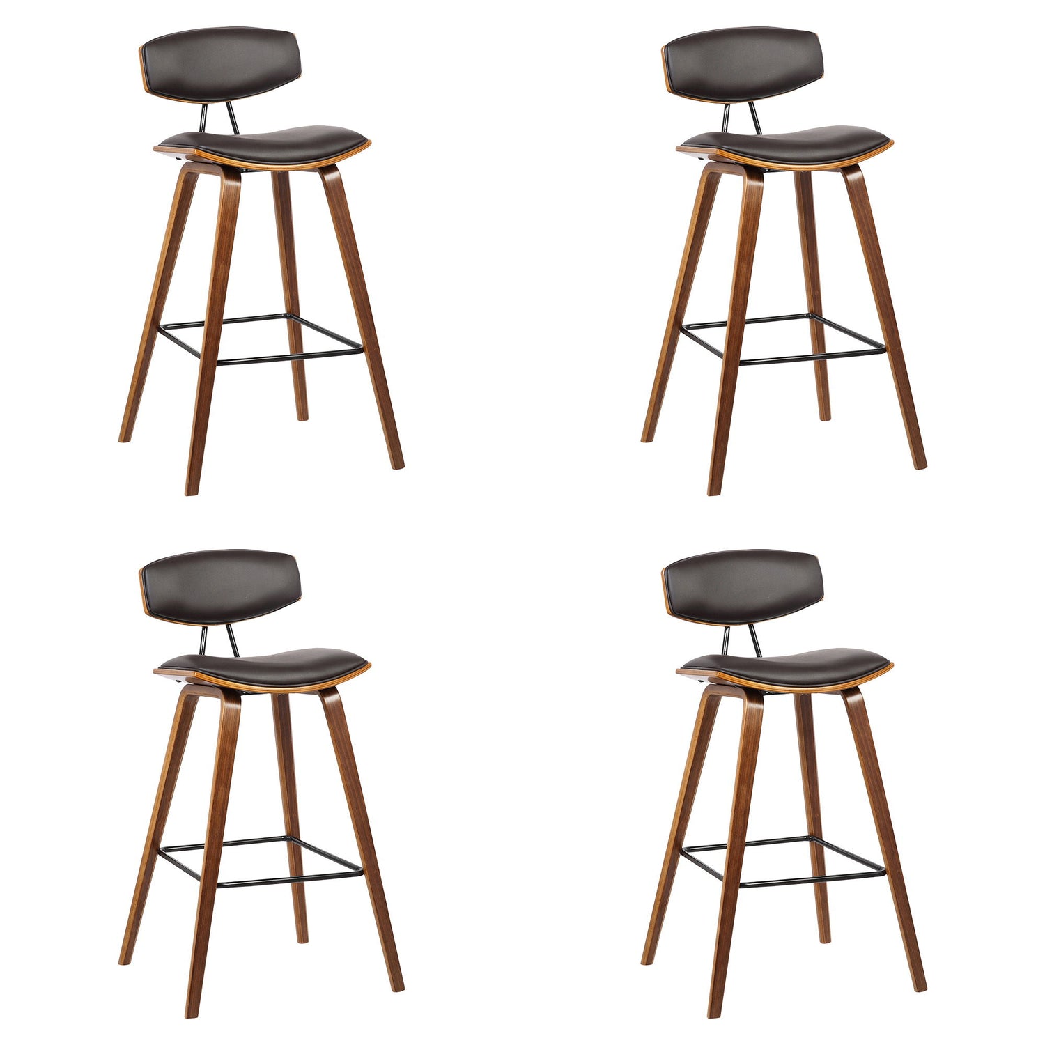 Fox - 28.5" Bar Height Mid-Century Modern Bar Stool (Set of 4) - Brown Faux Leather And Walnut Wood