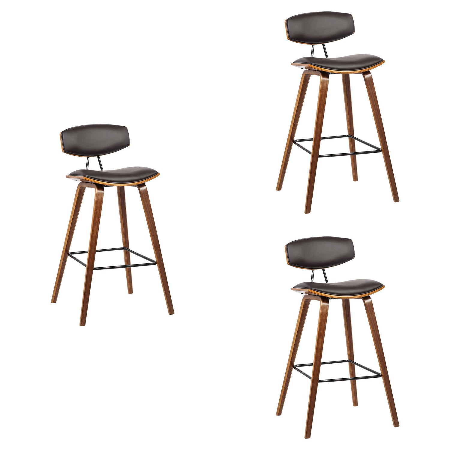 Fox - 28.5" Bar Height Mid-Century Modern Bar Stool (Set of 3) - Brown Faux Leather And Walnut Wood