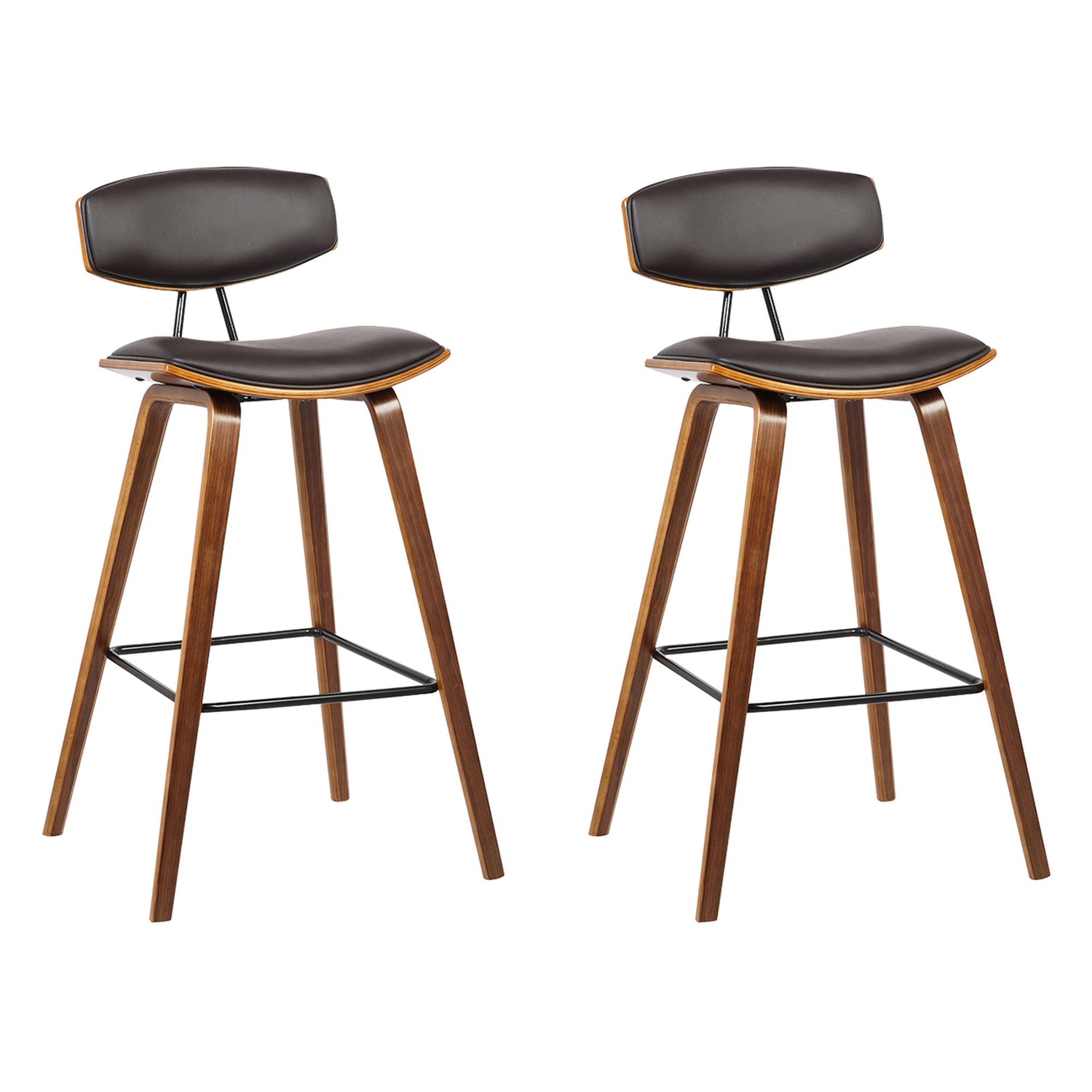 Fox - 28.5" Bar Height Mid-Century Modern Bar Stool (Set of 2) - Brown Faux Leather And Walnut Wood