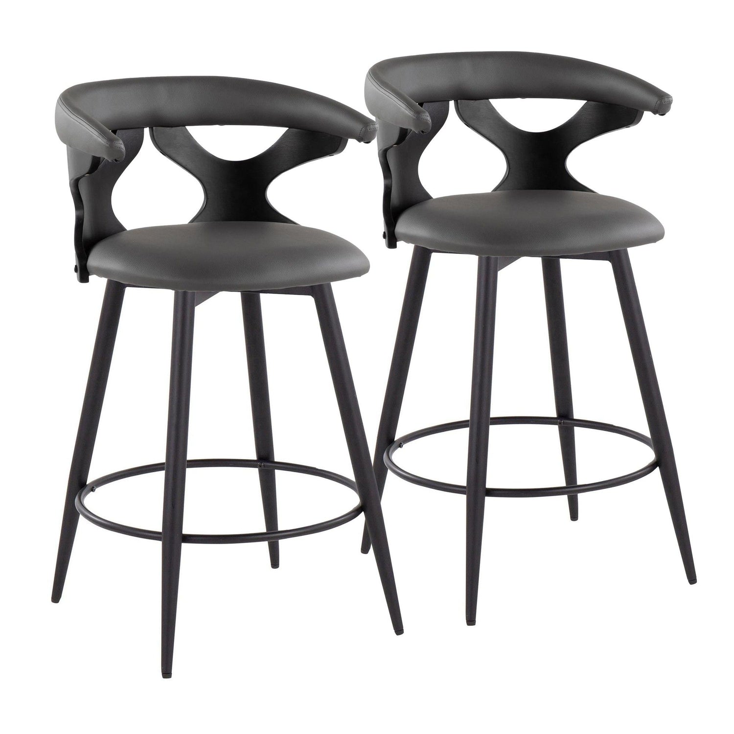 Gardenia - 25" Fixed-Height Counter Stool With Swivel And Rounded Black Metal Footrest (Set of 2) - Black Metal, Black Wood And Gray Faux Leather is backordered and will ship as soon as it is back in stock.