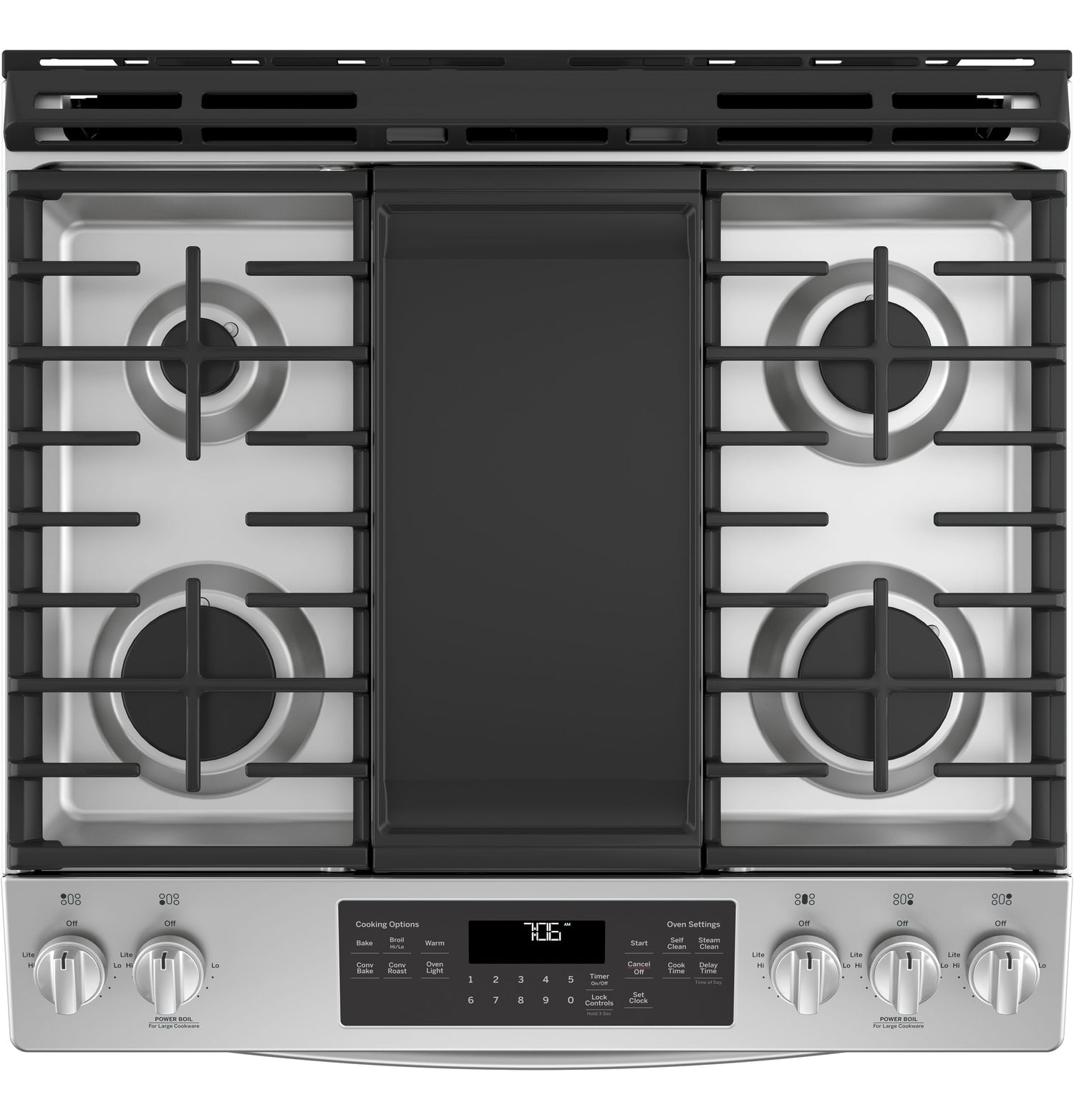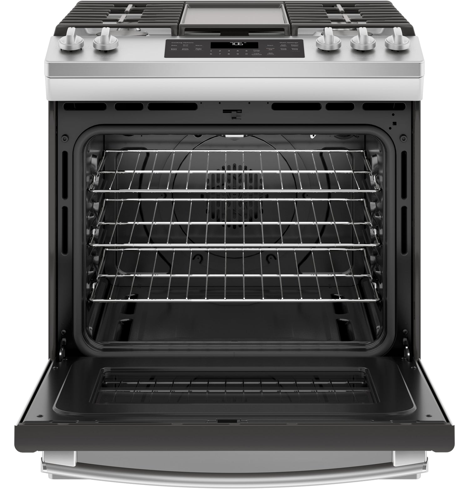 (BR)(B)Fit Guarantee(/B)(P)Replace your old 30" free-standing range with a new 30" slide-in model. GE slide-in ranges are guaranteed for an exact fit or GE Appliances will pay up to $300 toward modifications. See offer criteria and details(/P)(BR)(B)Edge-to-edge cooktop(/B)(P)A large cooking surface gives you extra room for pots and pans of all sizes and lets cookware move easily from burner to burner(/P)(BR)(B)Extra-large integrated non-stick griddle(/B)(P)Cook up to six grilled cheeses at once on the industry's largest integrated griddle(/P)(BR)(B)18,000 BTU Power Boil burner(/B)(P)Prepare your favorite pasta dishes faster by boiling water in less time(/P)(BR)(B)Gas convection(/B)(P)Evenly bake foods like roasts and cookies with this helpful feature that uses a fan to circulate heated air(/P)(BR)(B)Self-clean with Steam Clean option(/B)(P)Clean your oven the way you want(/P)(BR)(B)10,000 BTU oval burner(/B)(P)Large oval fifth burner is ideal for griddle or odd-size cookware(/P)(BR)(B