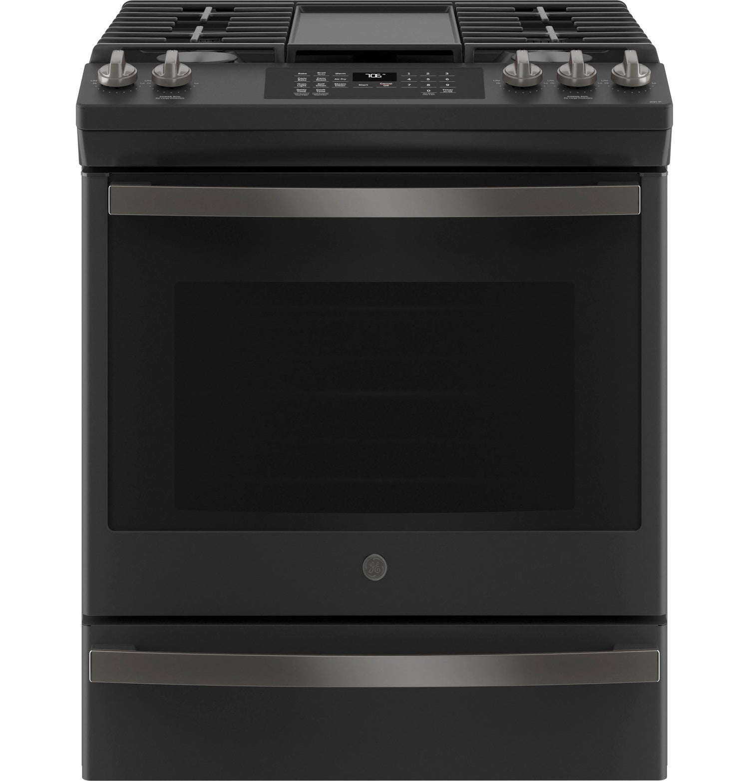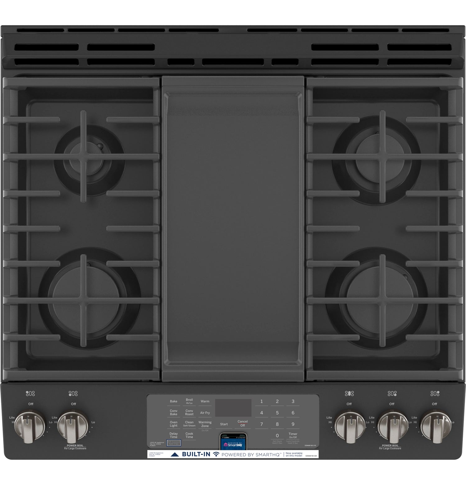 (BR)(B)No Preheat Air Fry(/B)(P)Cook healthier, crispier versions of your favorite foods in less time, thanks to an air fryer right in your oven that doesn't require preheating, a basket or a special tray(/P)(BR)(B)Built-in WiFi(/B)(P)This smart oven features built-in WiFi so you can control oven functions with the SmartHQ app on your smart device(/P)(BR)(B)Fit Guarantee(/B)(P)Replace your old 30" free-standing range with a new 30" slide-in model. GE slide-in ranges are guaranteed for an exact fit or GE Appliances will pay up to $300 toward modifications. See offer criteria and details(/P)(BR)(B)Edge-to-edge cooktop(/B)(P)A large cooking surface gives you extra room for pots and pans of all sizes and lets cookware move easily from burner to burner(/P)(BR)(B)Extra-large integrated non-stick griddle(/B)(P)Cook up to six grilled cheeses at once on the industry's largest integrated griddle(/P)(BR)(B)18,000 BTU Power Boil burner(/B)(P)Prepare your favorite pasta dishes faster by boiling wat