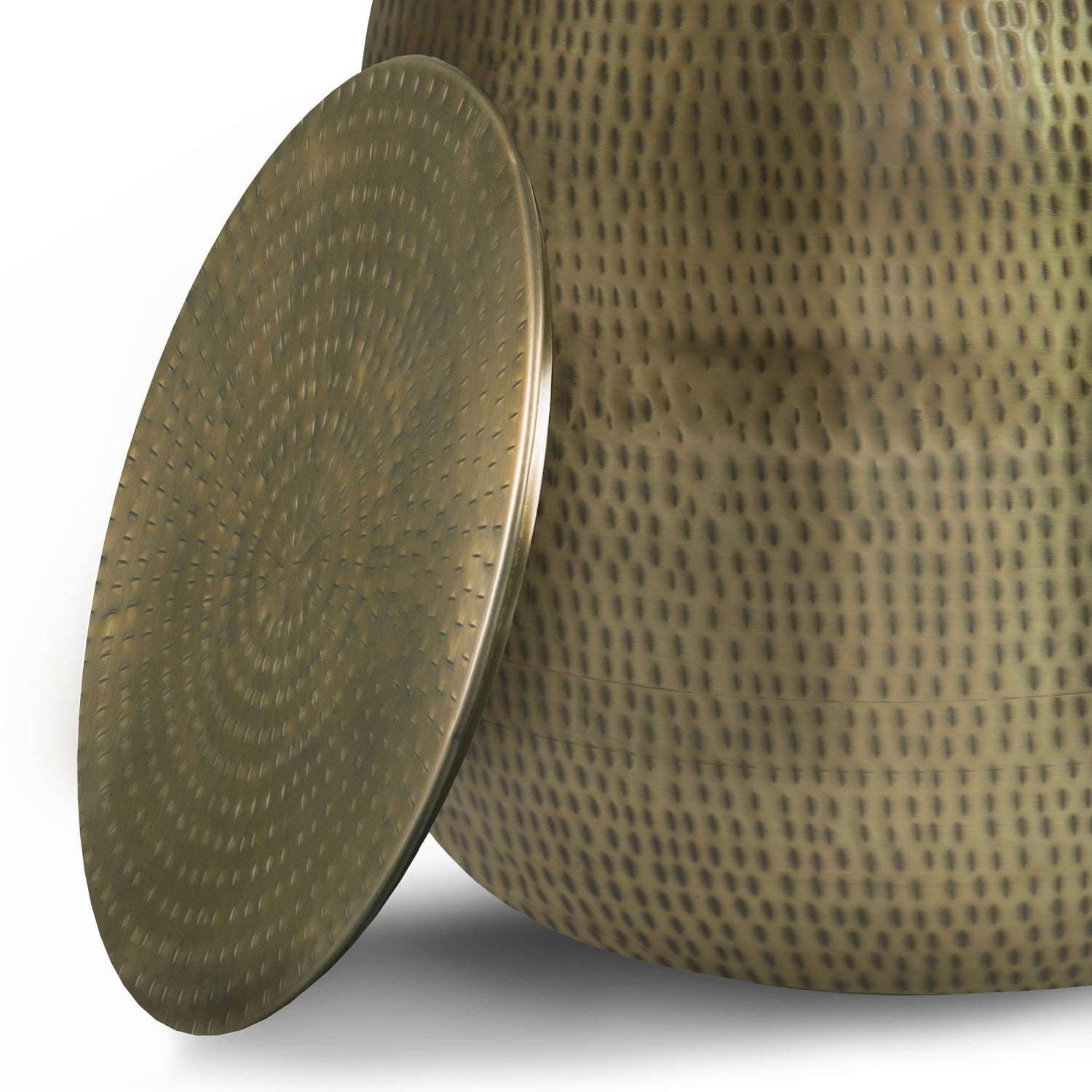 - Features hand hammered detail, Large drum shape with removable top that reveals plenty of storage