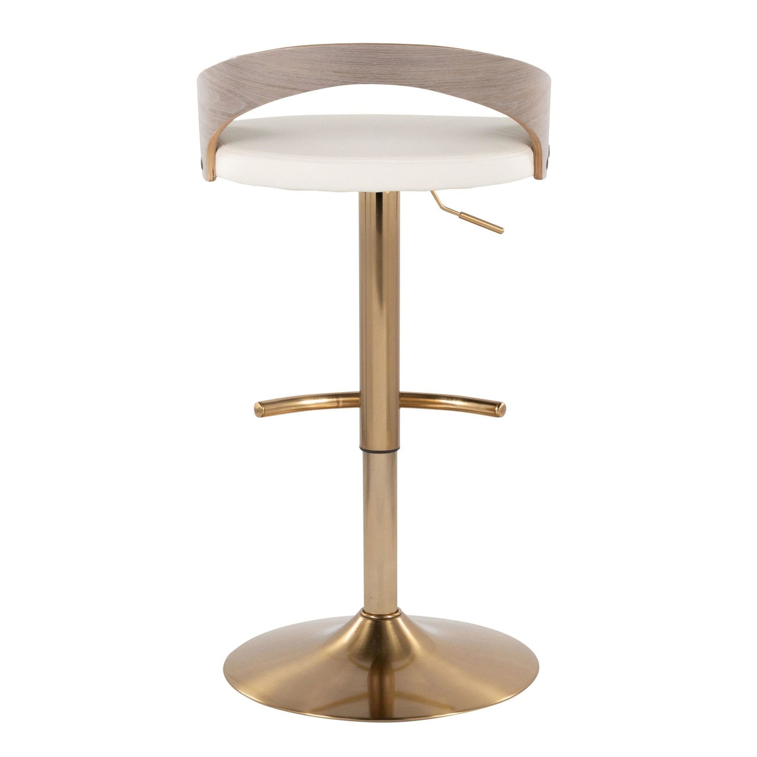 Grotto - Adjustable Barstool - Gold Metal, Light Gray Wood, White Faux Leather
