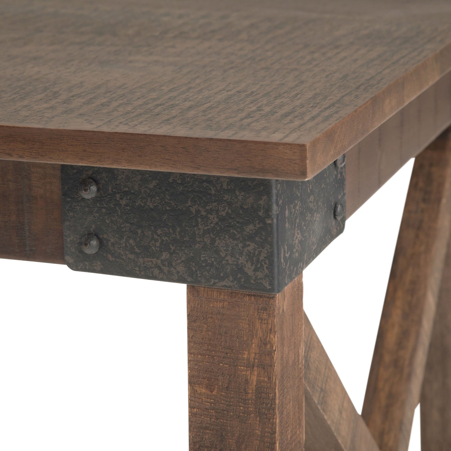 - Industrial, rustic design includes a sturdy frame featuring iron corner brackets with rivets