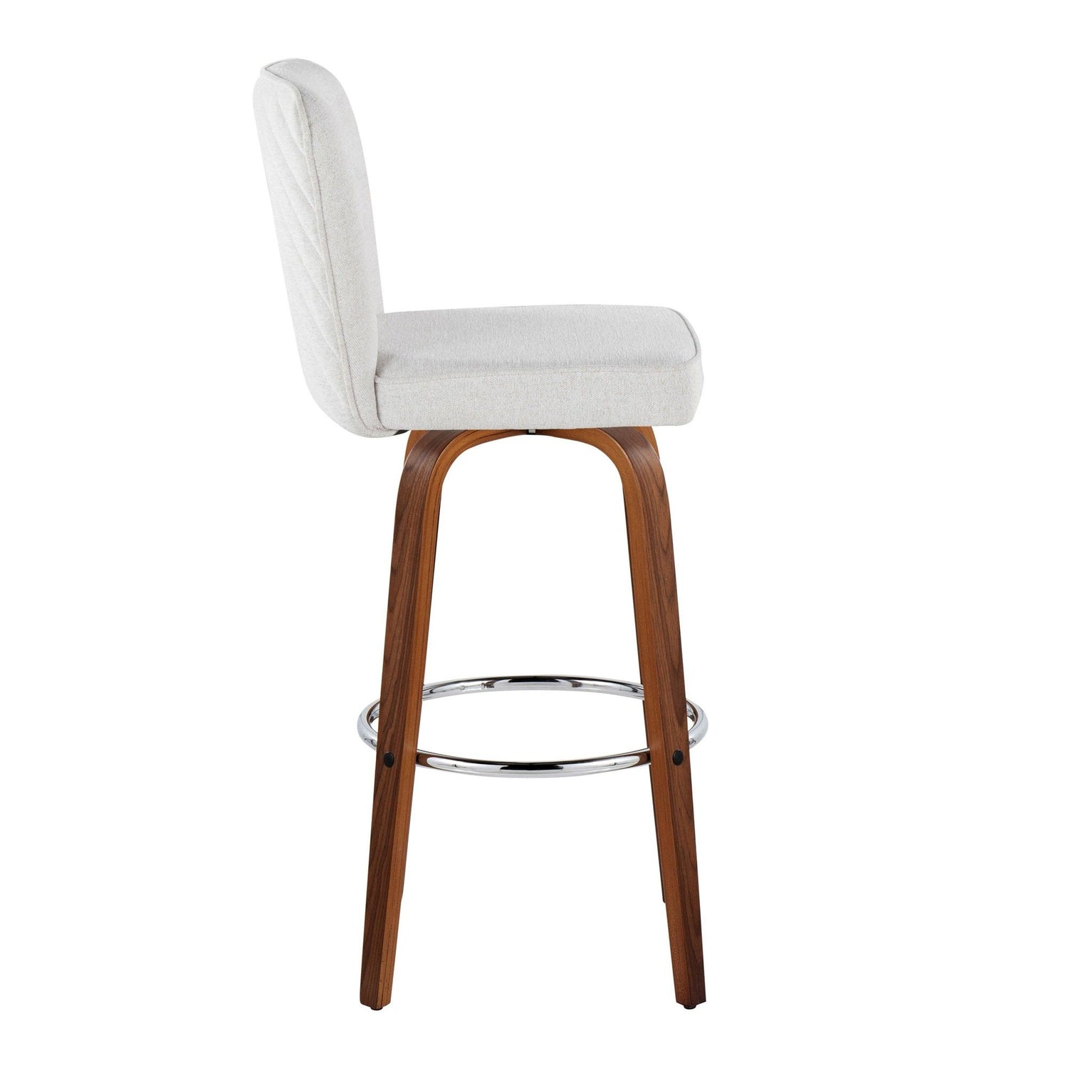 Henry - 30" Fixed-Height Barstool With Swivel (Set of 2) - Walnut Wood And White Fabric With Round Chrome Footrest
