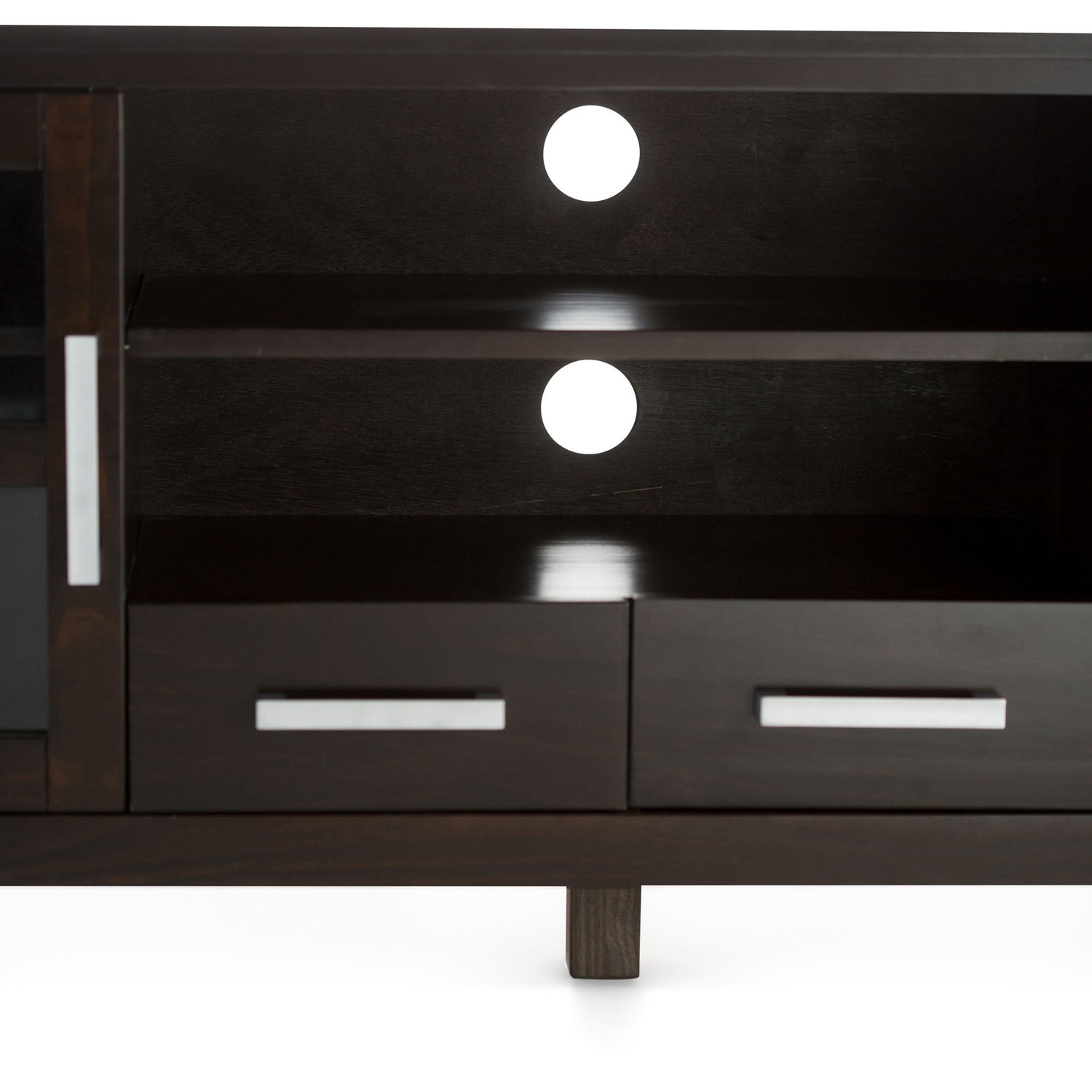 - Features tempered glass doors that open to cabinets with one (1) adjustable shelf each, three central drawers with metal drawer glides and open top space for media devices.