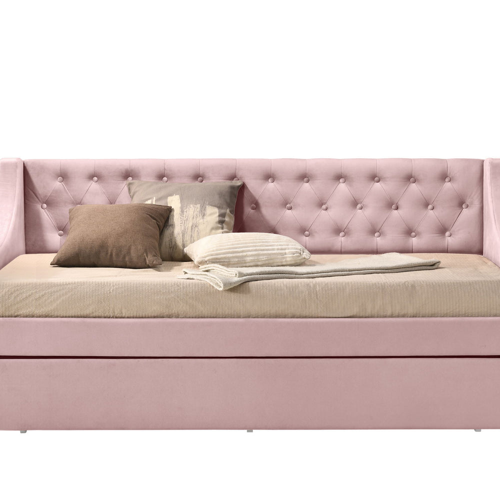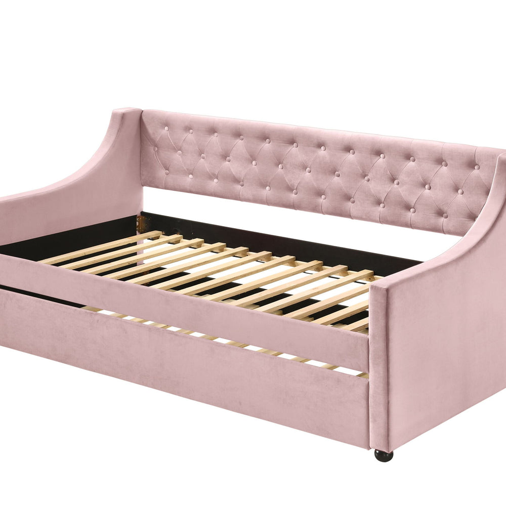 • Design and Features: This daybed includes a slat system, a trundle for additional sleeping space, and is fully upholstered with a button-tufted design. It features solid wooden legs and a sloped shape for added texture and style.