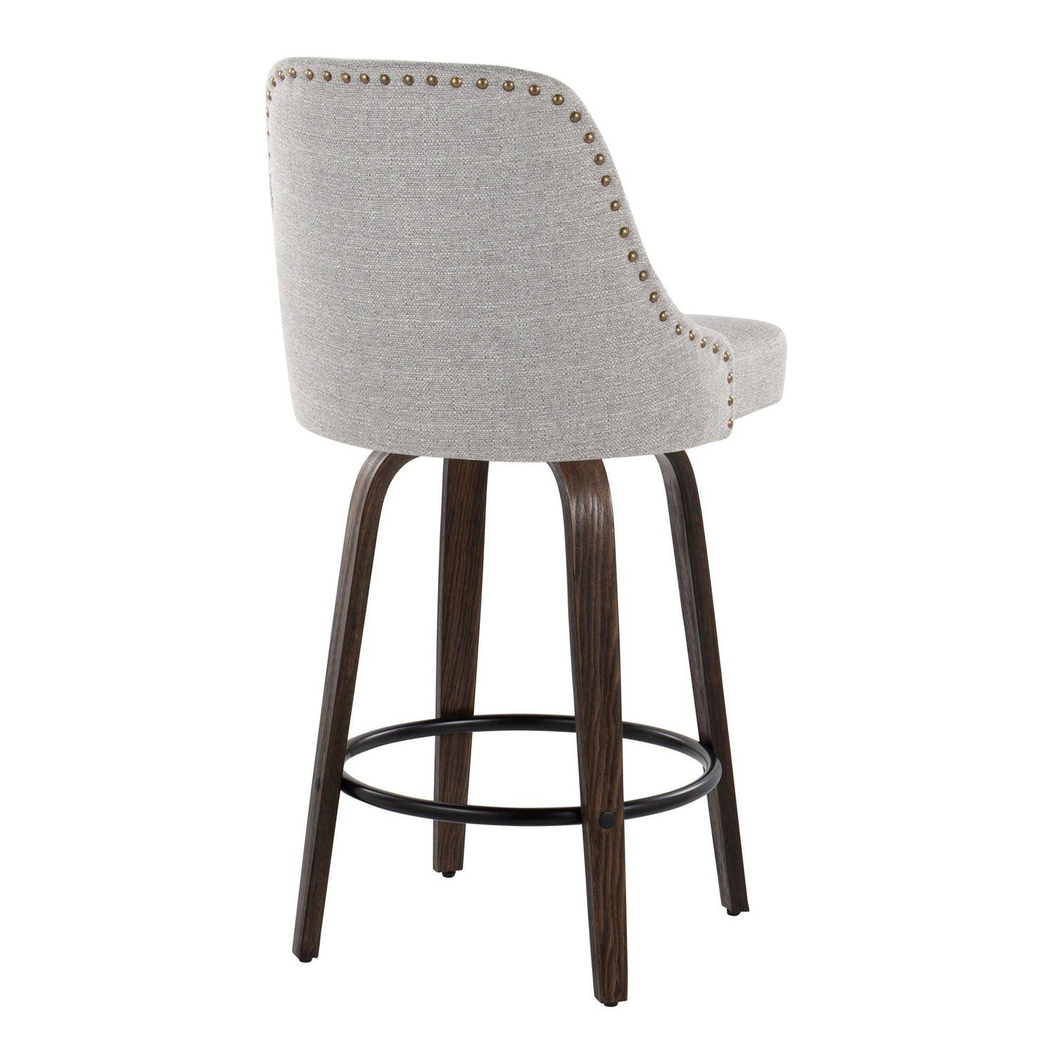 Marcel - 27" Fixed-Height Counter Stool With Swivel And Round Black Metal Footrest (Set of 2) - Walnut Glazed Wood And Light Gray Fabric With Brass Nailhead Trim