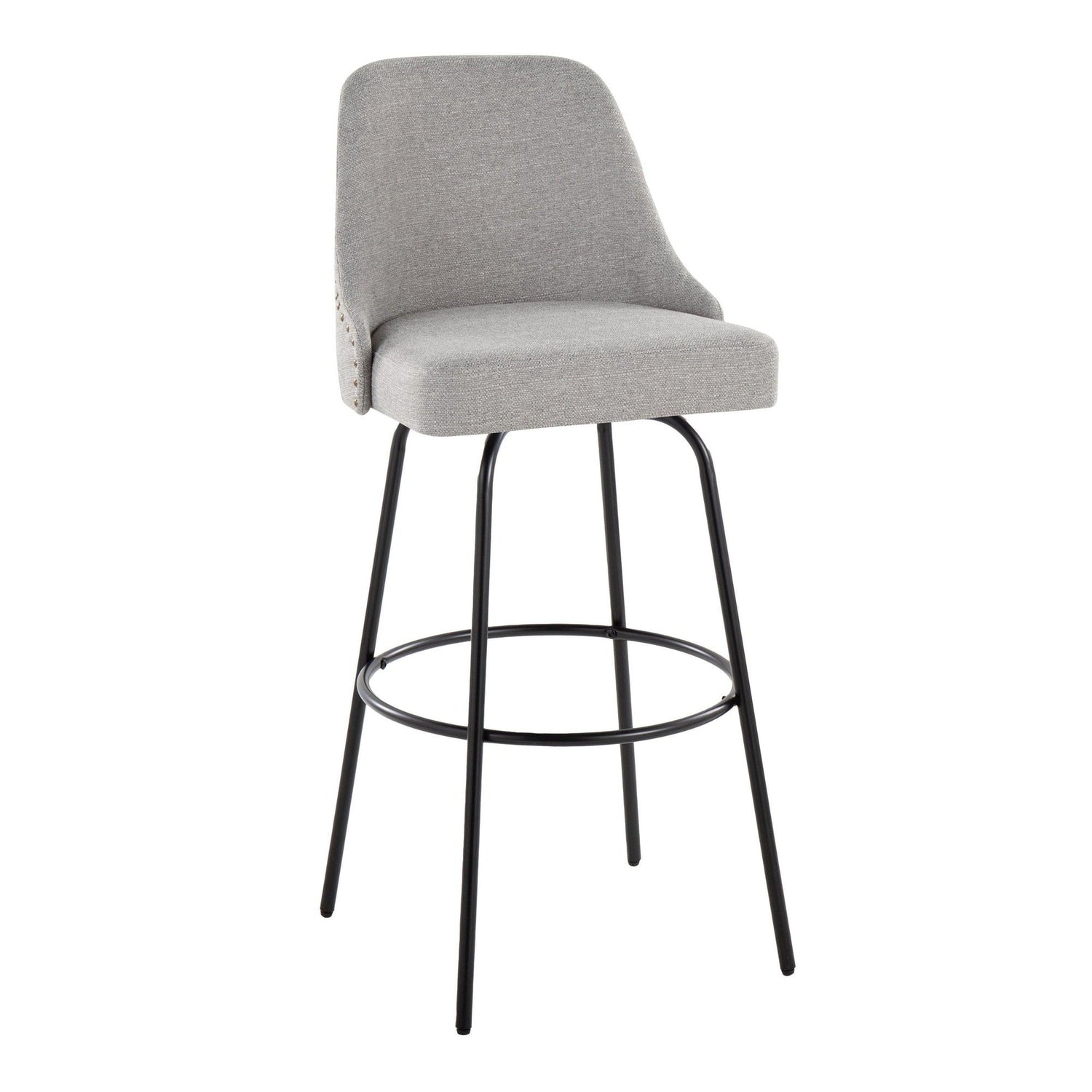 Marcel - 30" Fixed-Height Barstool With Swivel And Round Black Metal Footrest (Set of 2) - Black Metal And Light Gray Fabric With Brass Nailhead Trim