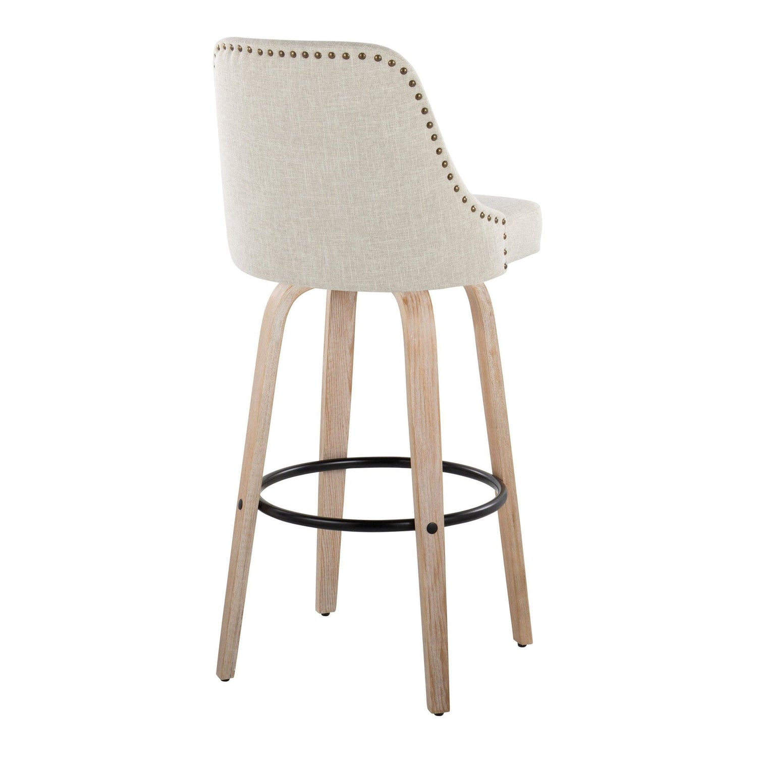 Marcel - 30" Fixed-Height Barstool With Swivel And Round Black Metal Footrest (Set of 2) - Whitewashed Wood And Cream Fabric With Brass Nailhead Trim