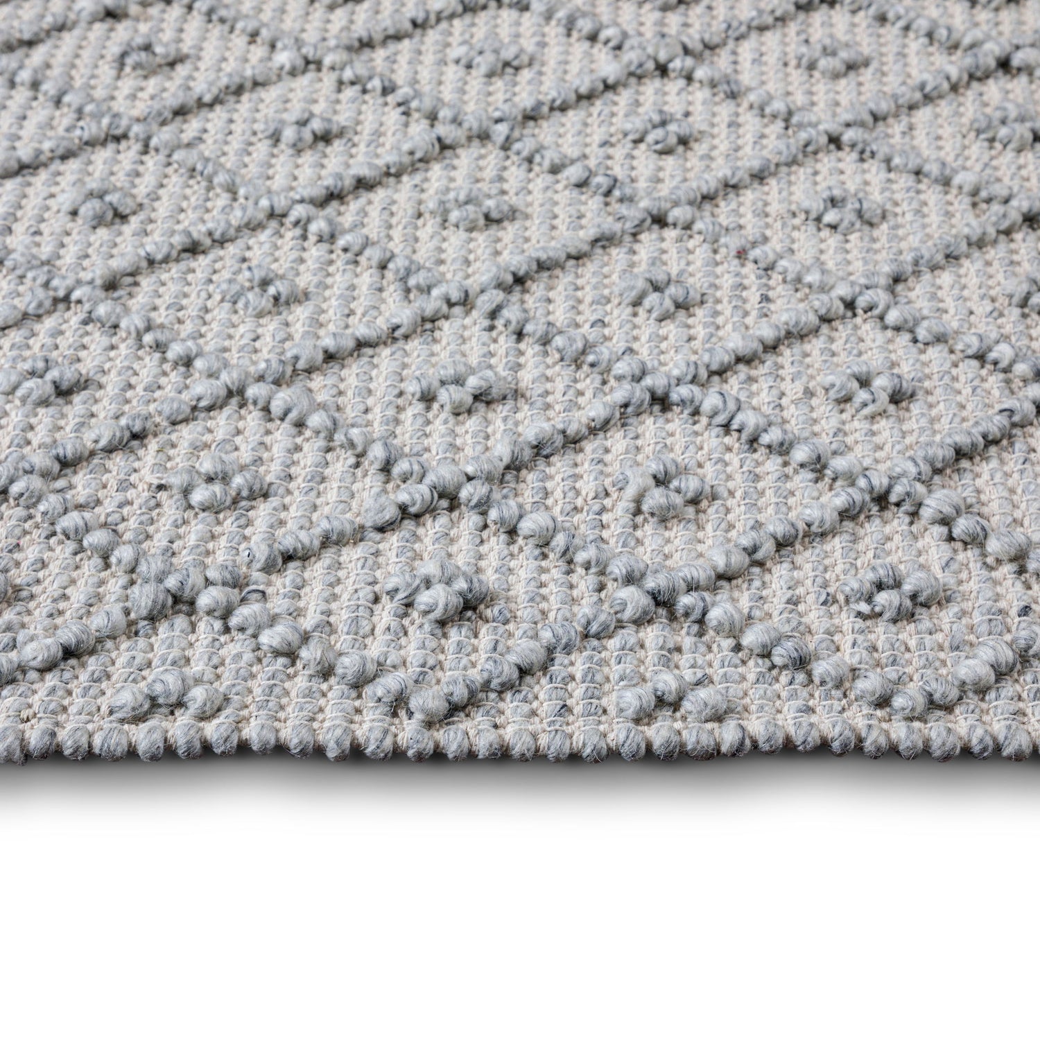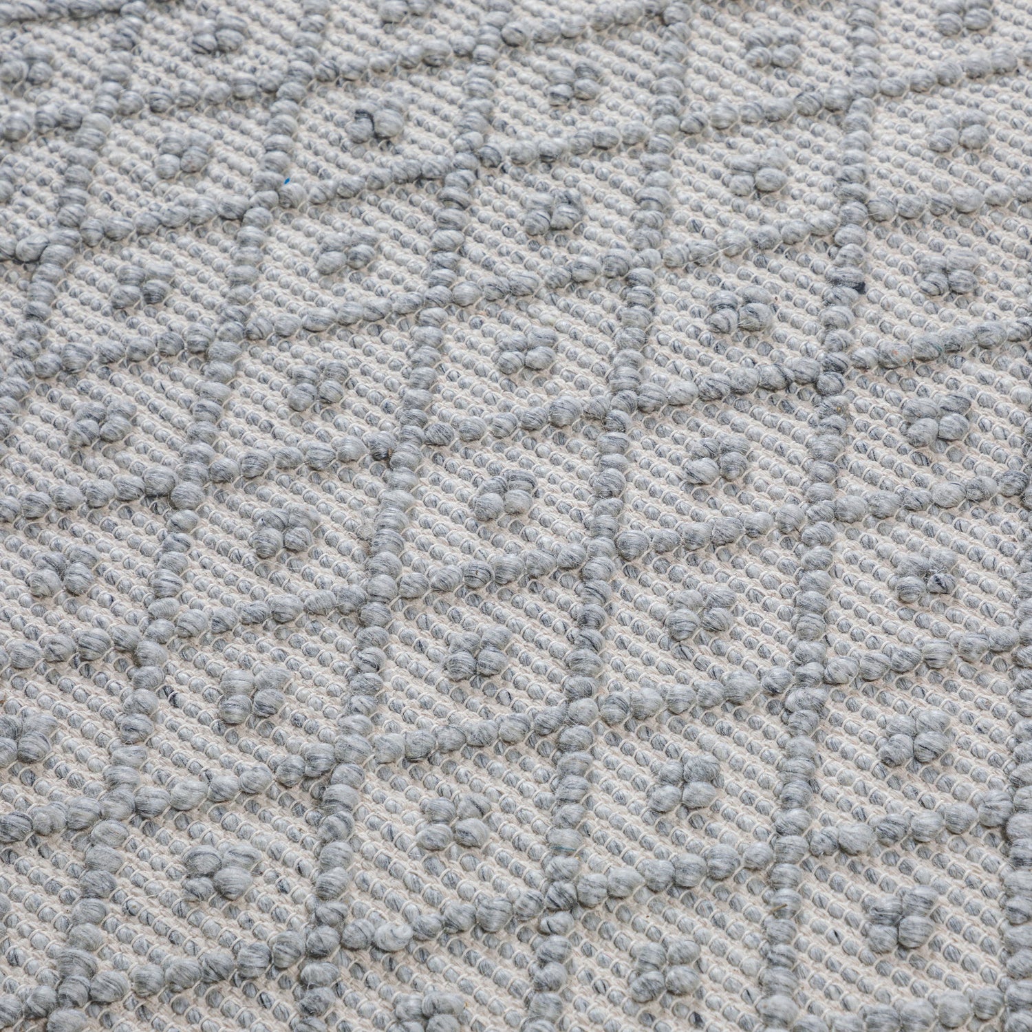 - Detailed with a geometric pattern in silver grey featuring a hand-knotted fringe