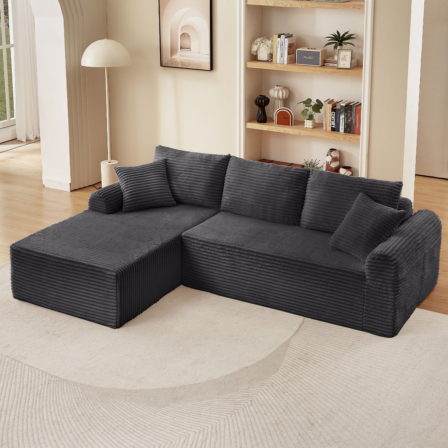 Full Compression Chaise Lounge Set Modular Corduroy Sectional With Arched Armrests Non Slip Base Includes 3 Back Cushions & 2 Throw Pillows - Dark Gray