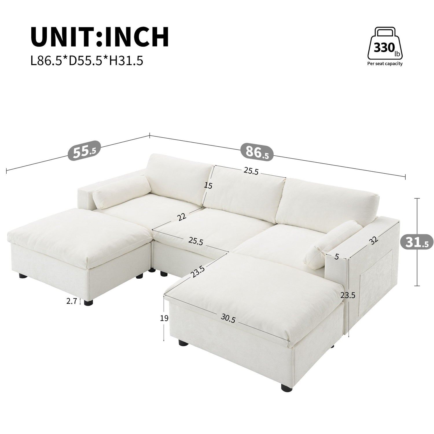 Modular Sectional With Storage Pockets, 5 Seat U Shaped Couch Set With Pillows Free Combination Modern Cloud Sofa With 2 Movable Ottoman - White