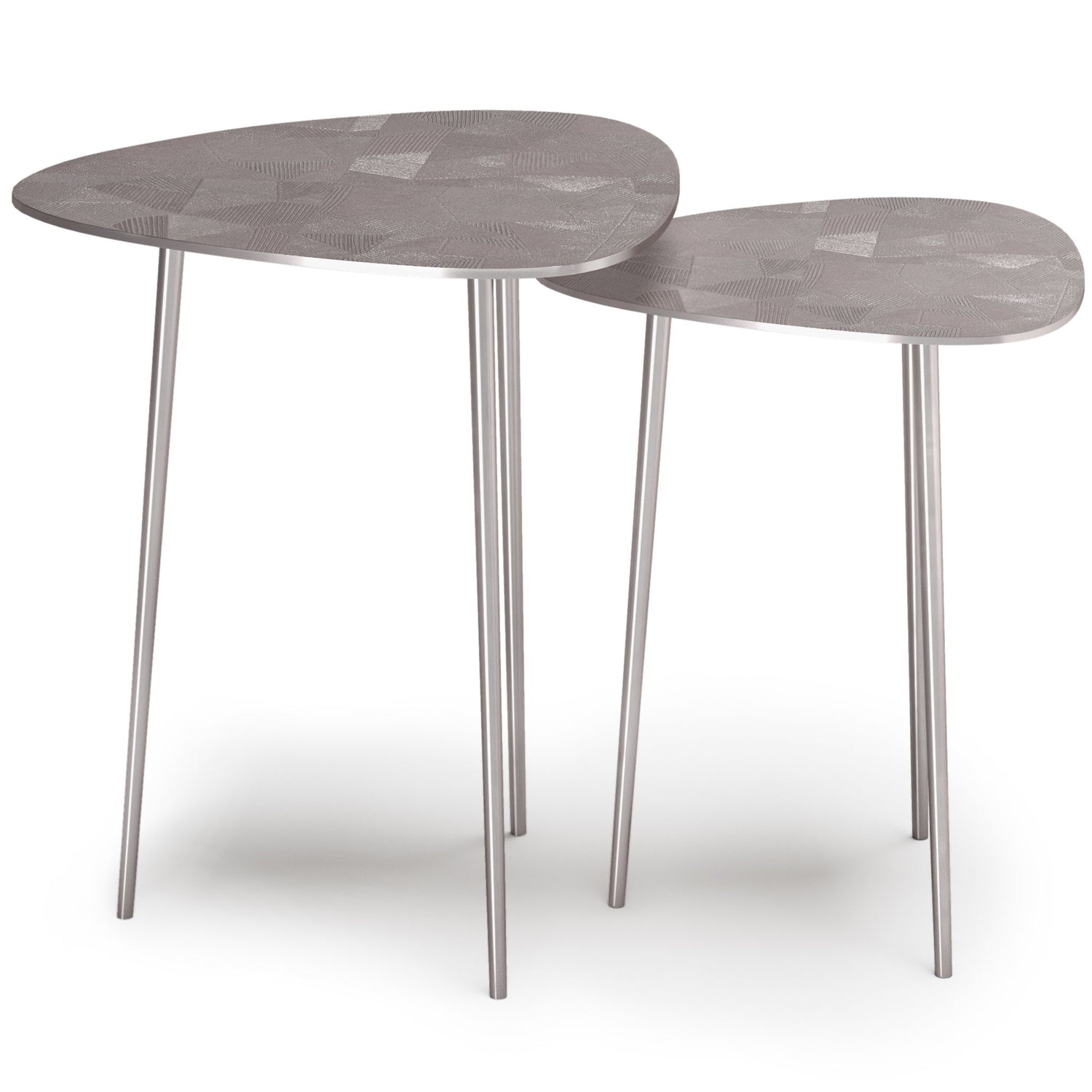 - Set includes: Two (2)Tables with etched geometric design on the tops and 3 legs