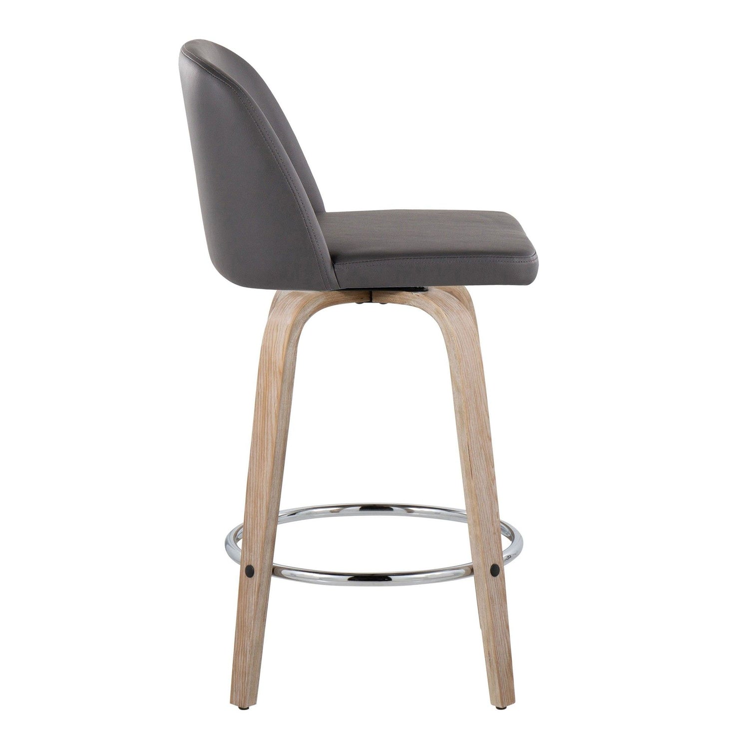 - Bent wood legs with round chrome metal footrest