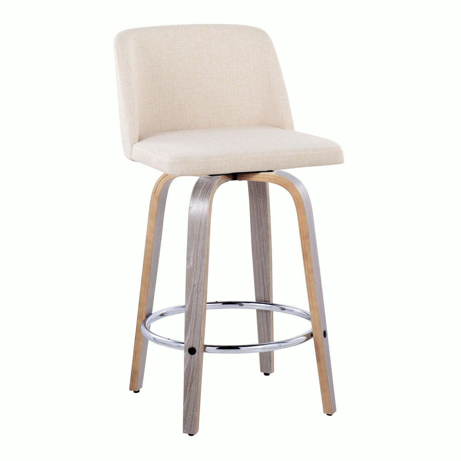 - Bent wood legs with round chrome metal footrest