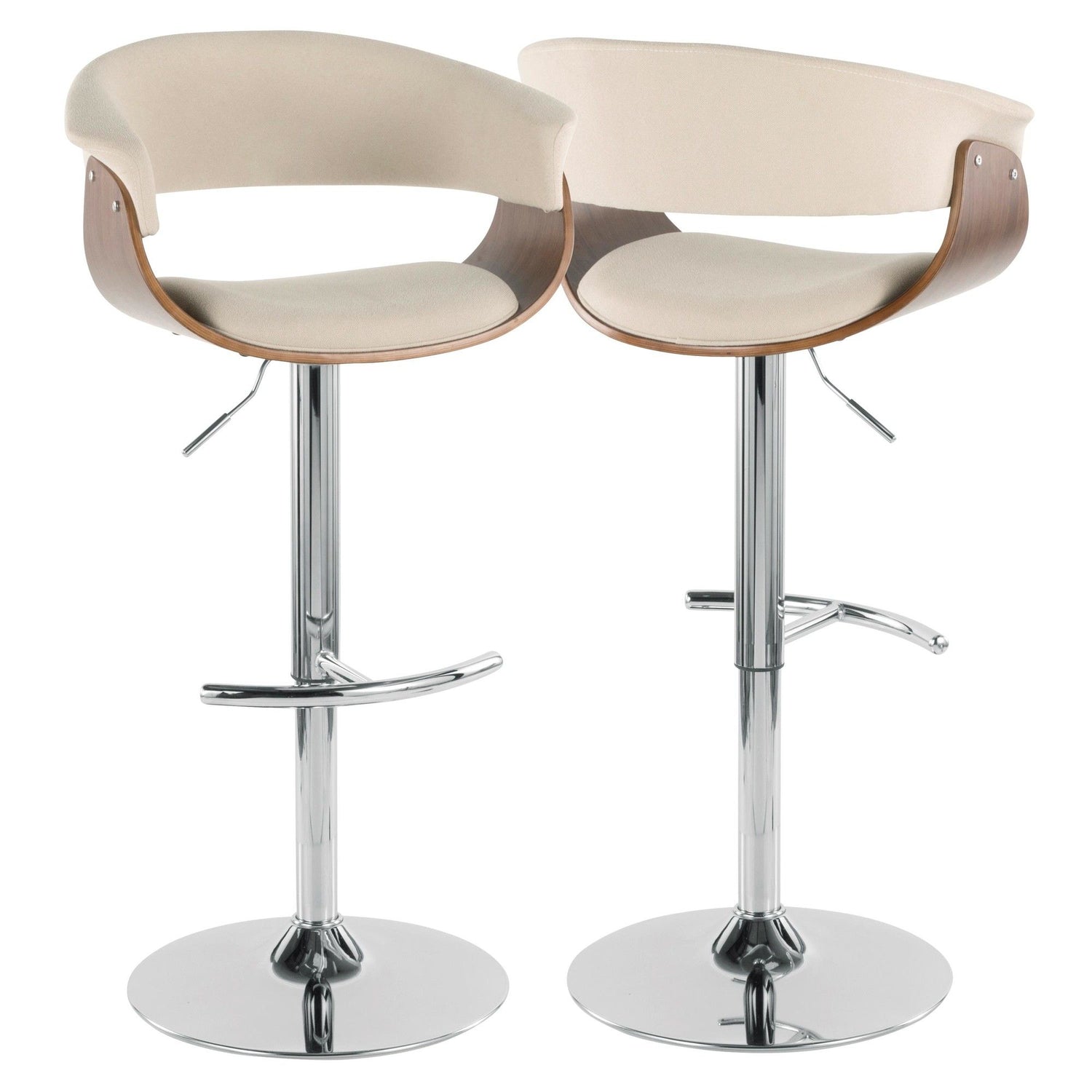 Vintage Mod - Adjustable Barstool With Swivel - Chrome Metal, Walnut Wood And Cream Fabric With Rounded T Footrest